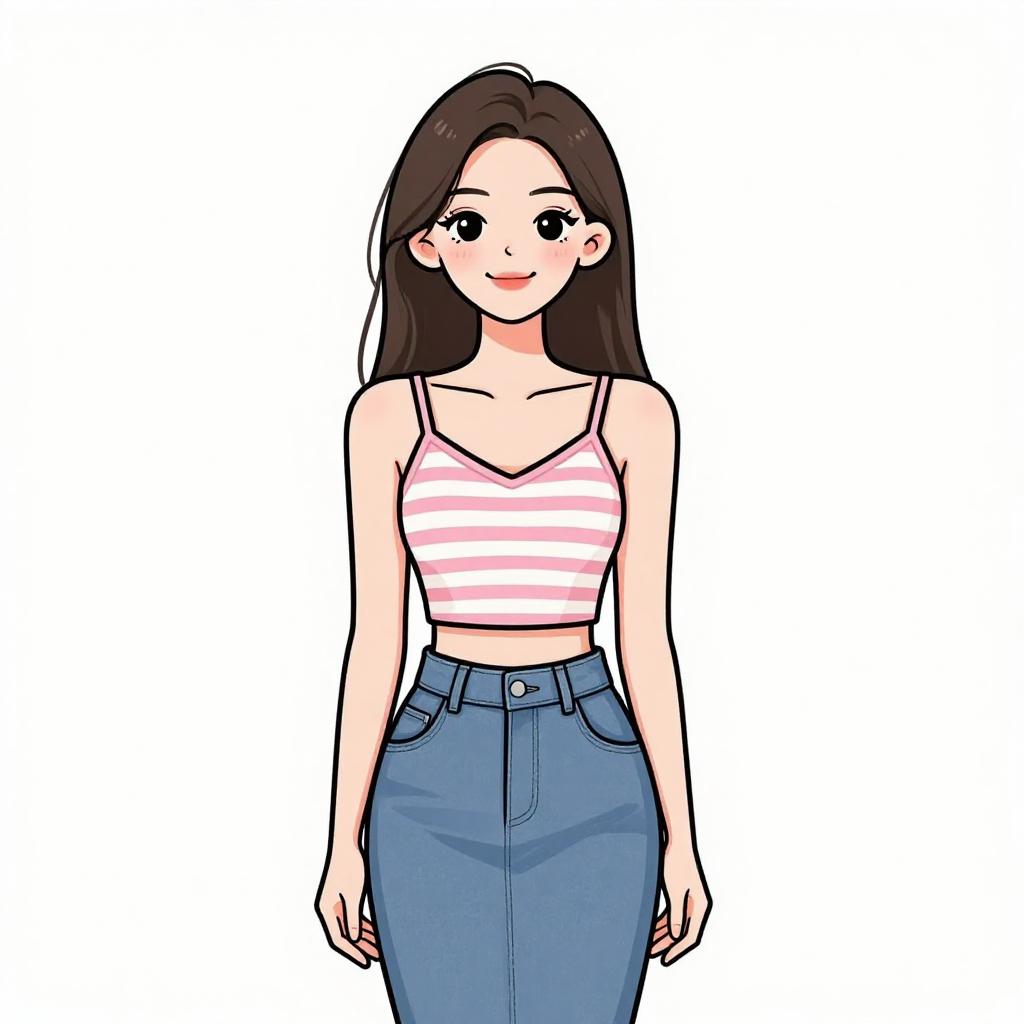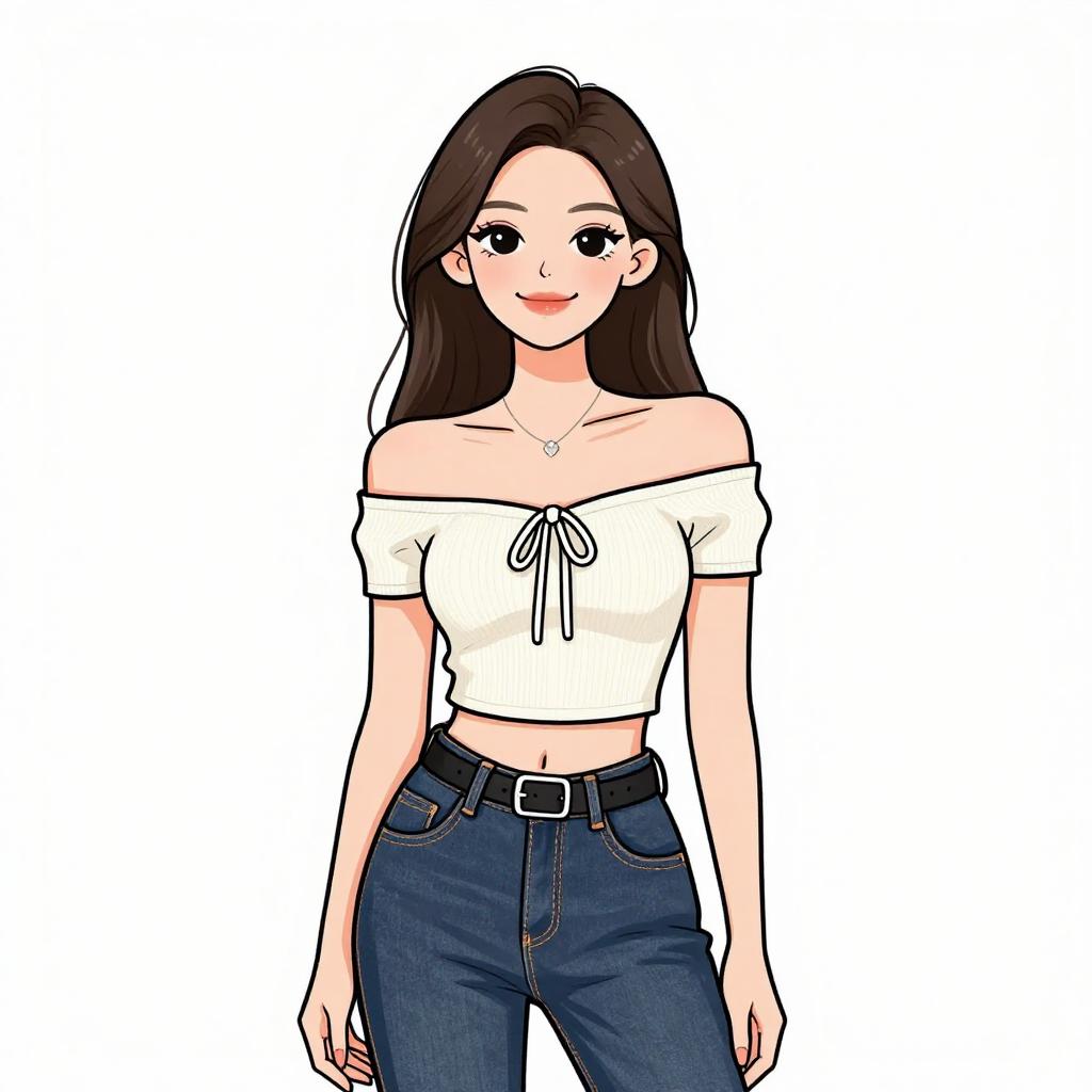 Woman with pretty face and pretty hair. smiling Woman, casual chic, off-the-shoulder crop top with horizontal stripes in green, red, and white on a navy-blue background, short sleeves, high-waisted black jeans, slim fit, black leather belt with a silver buckle, subtle necklace, white background. --sref 1467