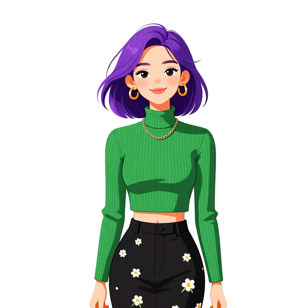 Woman with pretty face and pretty hair. smiling Woman, casual chic, white quarter-zip pullover with black trim on collar and cuffs, graphic print on sleeves, high-waisted green midi skirt with white floral pattern, thigh-high slit, black ankle boots with block heel, white socks, minimal makeup, hair in a high ponytail with bangs, studio background with a light gray floor and white walls. --sref 1467