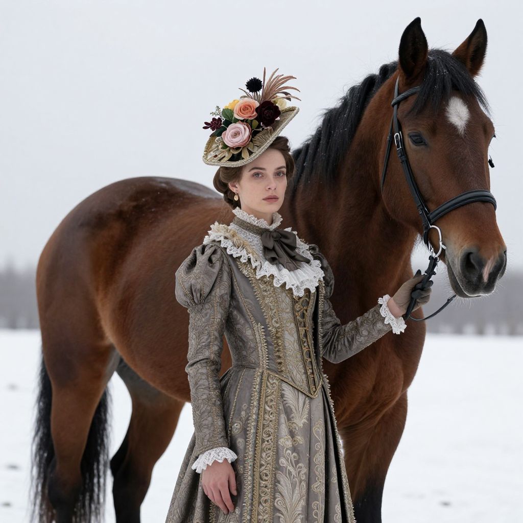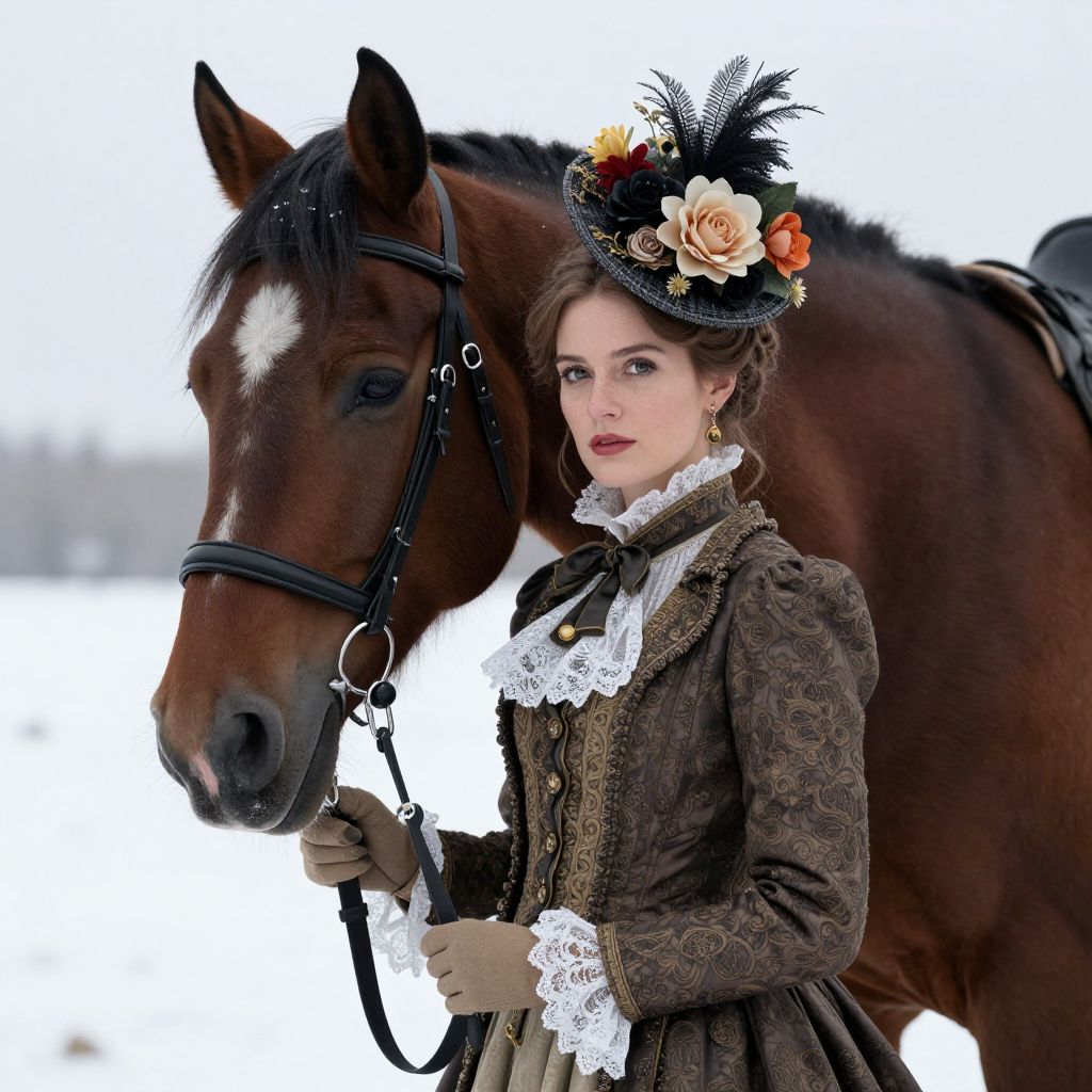 A woman in high-definition neo-Victorian attire, featuring intricate lace details and a festive floral hat, stands beside a majestic brown horse in a snowy landscape, exuding a blend of historical elegance and modern digital artistry.