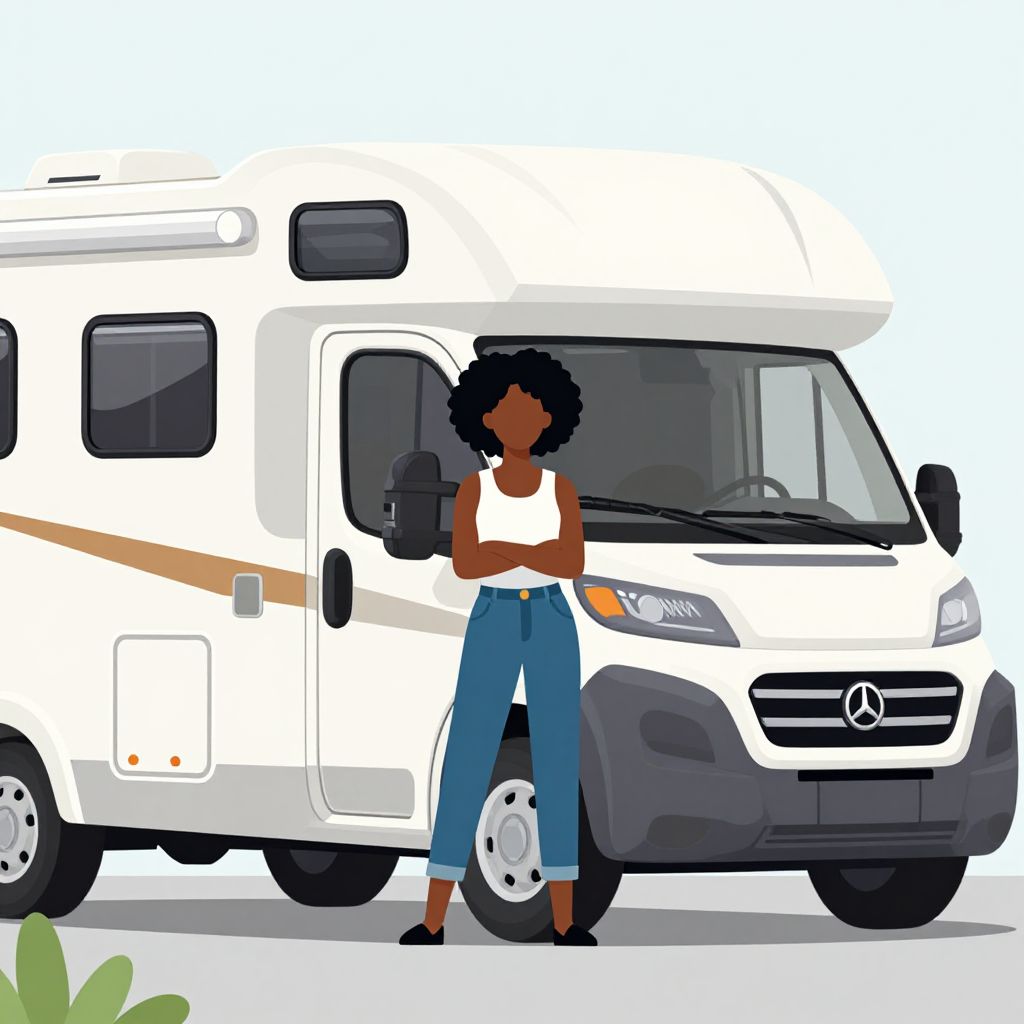Digital illustration of a dark-skinned woman with a bun, wearing an orange shirt and shorts, relaxing in a chair by a beige tent in a green