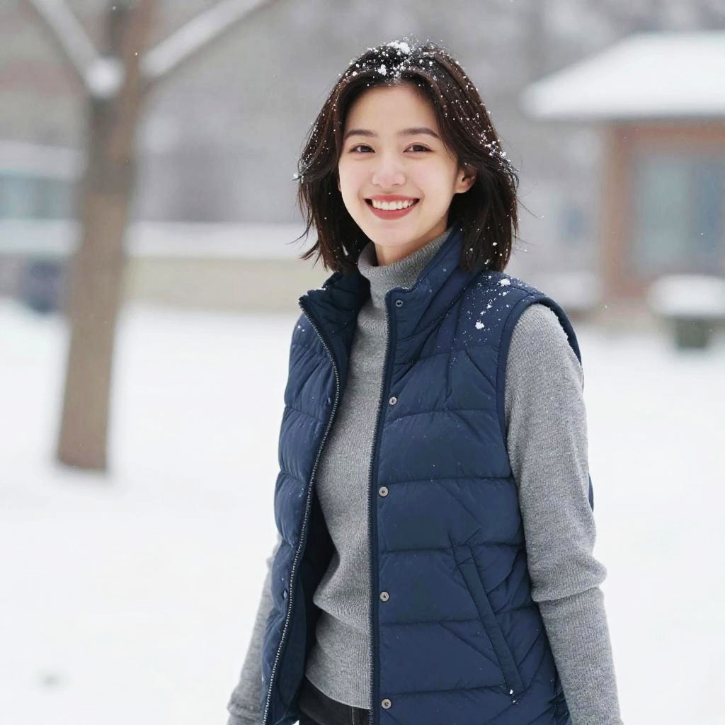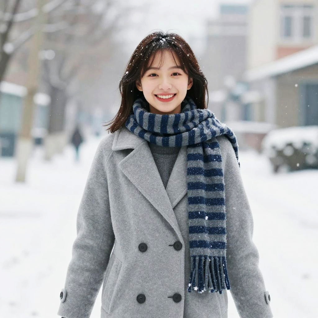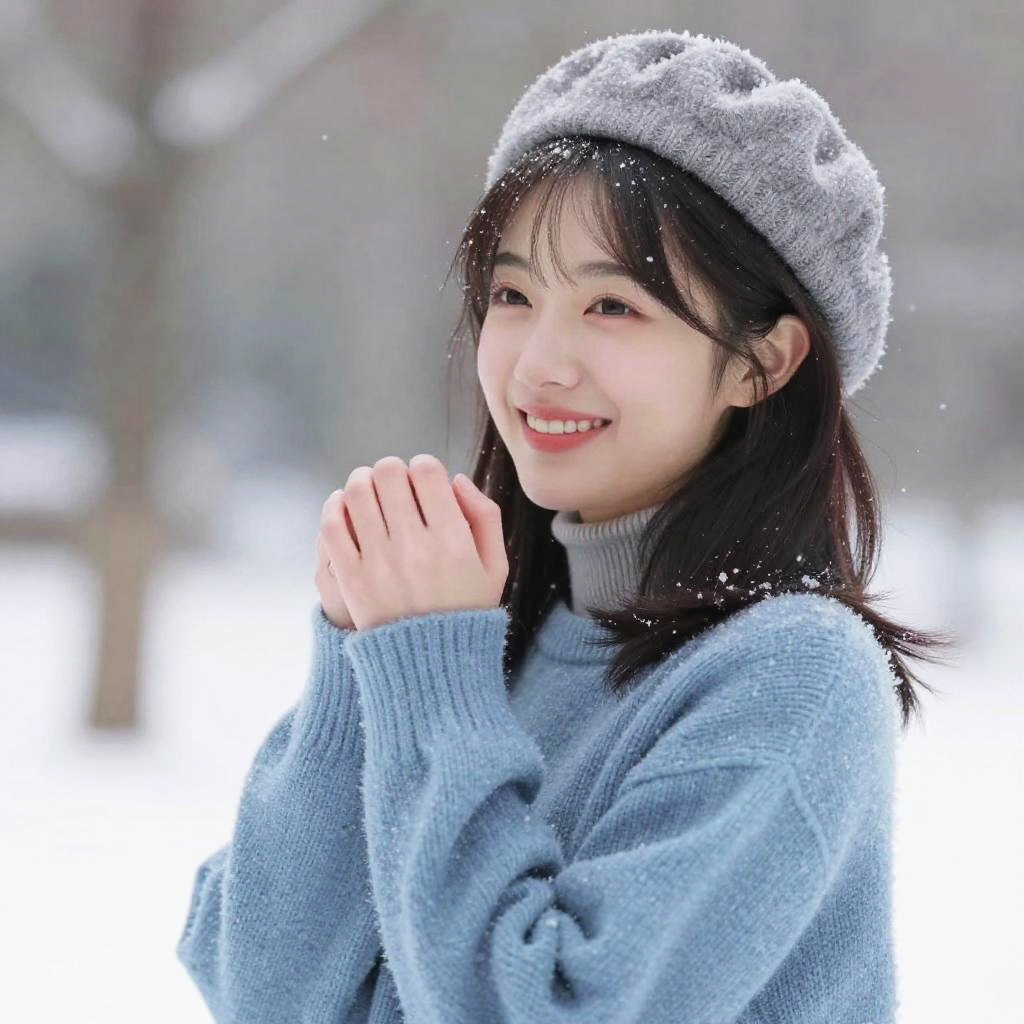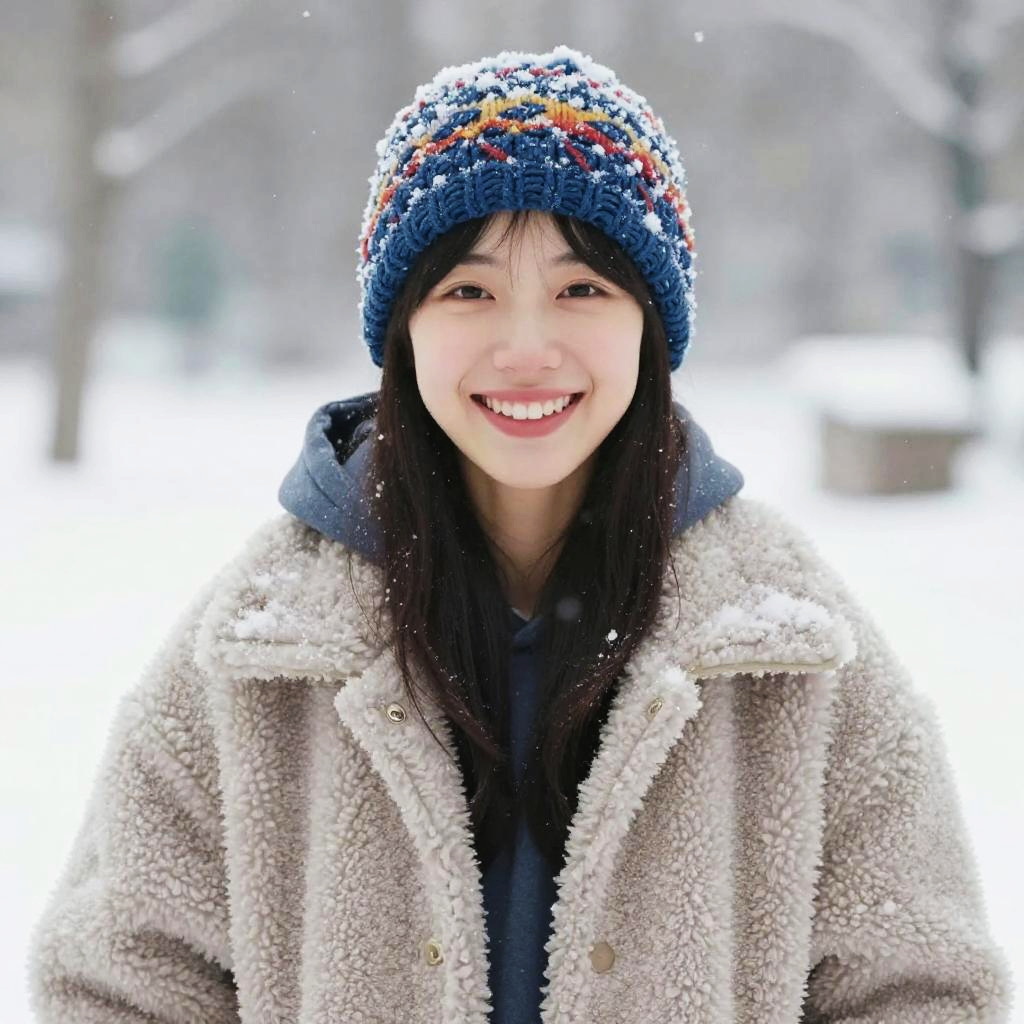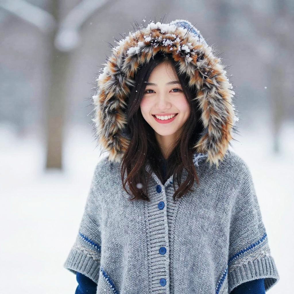 A happy young woman smiling and wearing a knitted poncho with a fur-trimmed hood in snowy weather, soft natural lighting, snowflakes falling around, winter atmosphere, blue and gray color tones