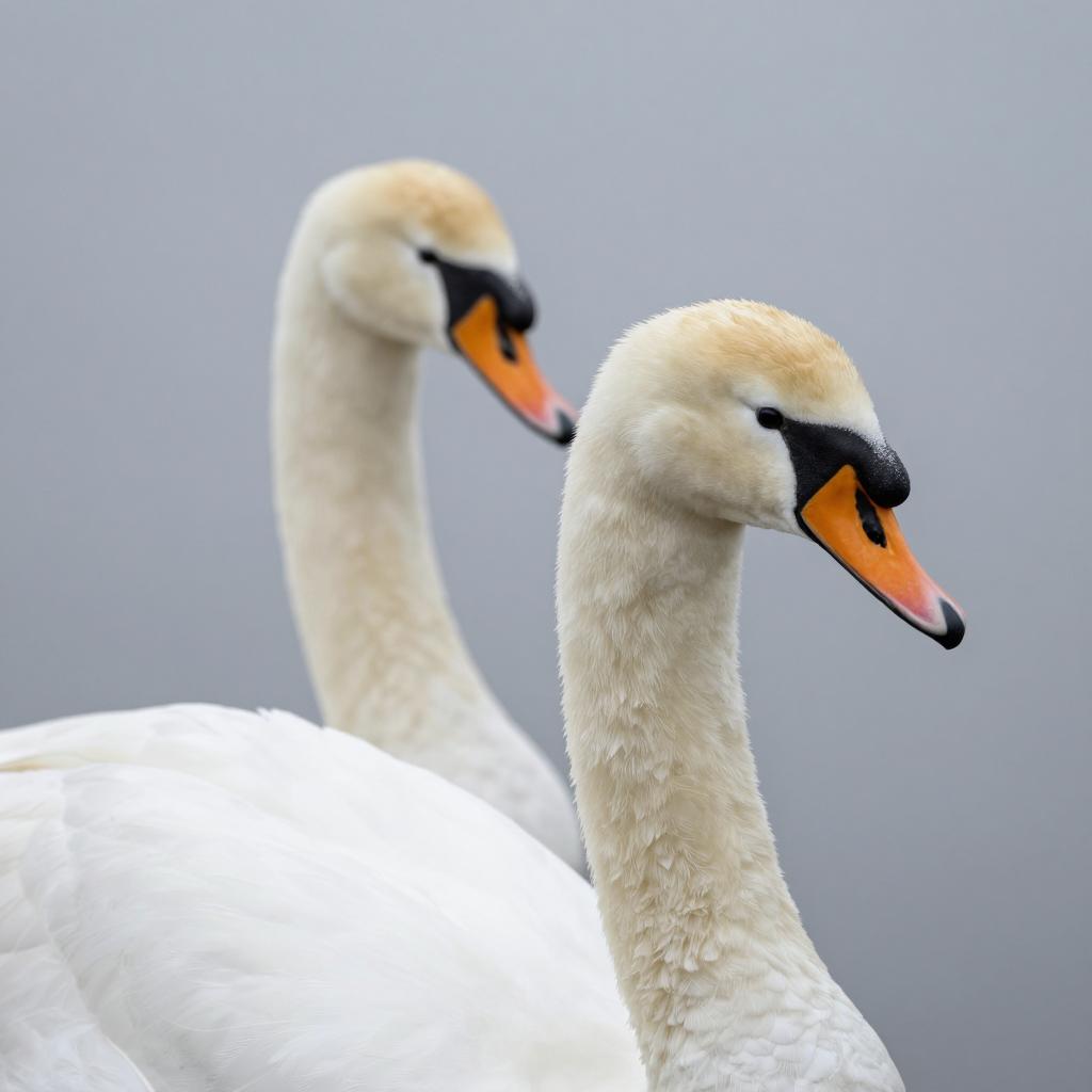 Two white swans with black beaks and orange bills, partially obscured by their fluffy, white feathers. One swan is facing forward, the other with head turned to the side. Smooth, grayish background. Swans positioned closely together.