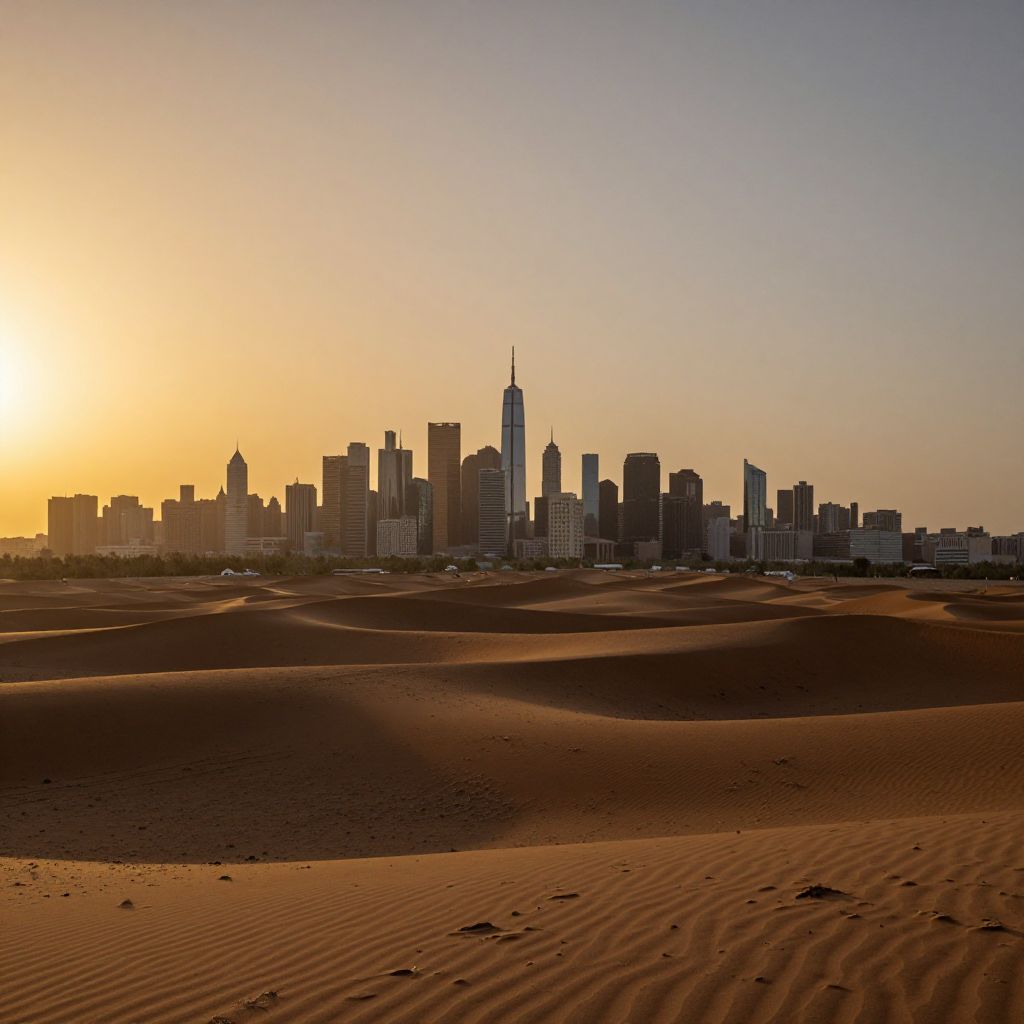 Photograph of a cityscape at sunset, featuring a skyline of tall skyscrapers silhouetted against a golden-orange sky. The foreground shows undulating, rippled sand dunes with a few scattered dark spots. The sun is low on the left, casting a warm glow over the scene. The buildings vary in height and shape, with the tallest being a pointed spire in the center. The overall composition contrasts the urban skyline with the natural desert landscape, creating a striking visual juxtaposition. The sky transitions from yellow near the horizon to a pale blue at the top.