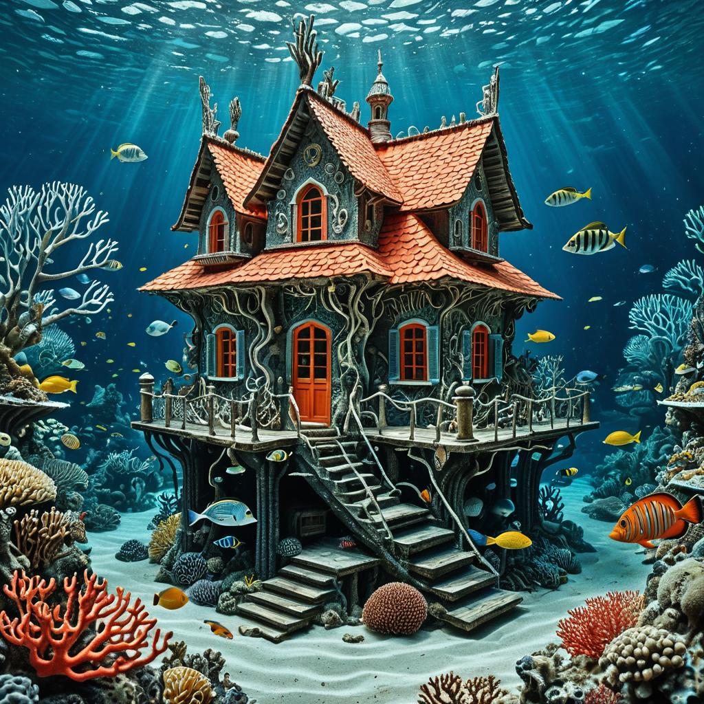 An underwater house made from coral fragments. Styled in the intricate, surreal art of Jacek Yerka, with fantastical, imaginative details. The scene features fish swimming, soft currents for an enchanting, dreamlike atmosphere, combining intricate textures and whimsical architecture to capture a sense of underwater fantasy.