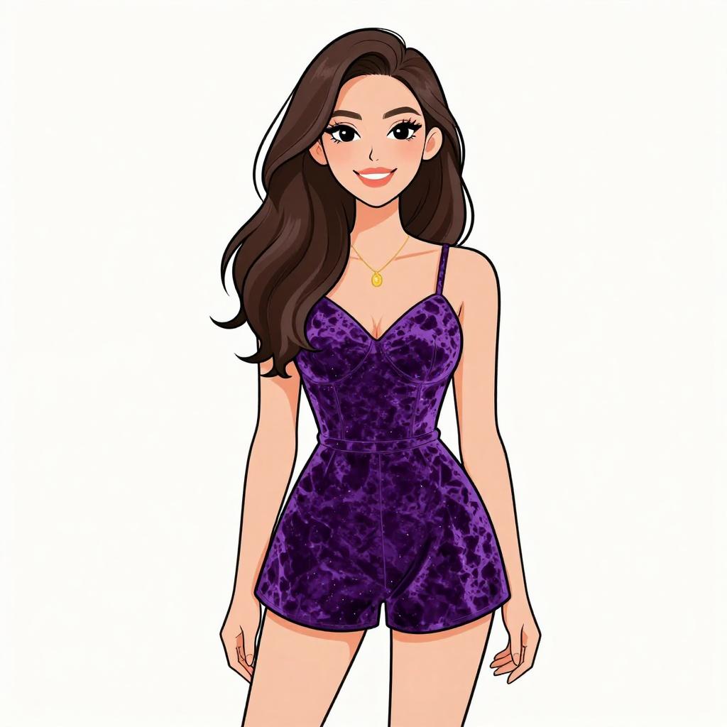 Woman with pretty face and pretty hair. smiling Woman, casual chic, crushed velvet romper in deep purple with a crinkled texture, V-neckline, thin spaghetti straps, fitted waist with a flared short bottom, delicate gold pendant necklace, minimalist white background. --sref 1467