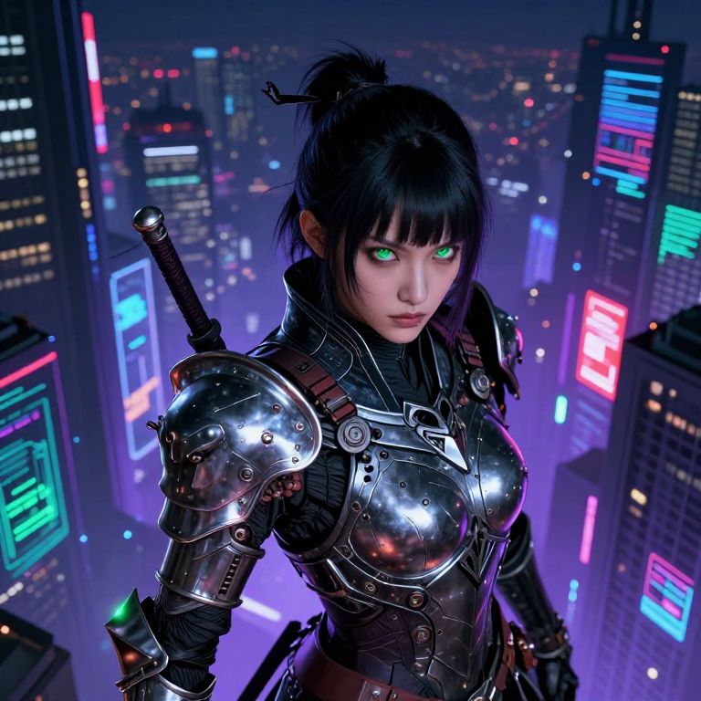 Digital art of an Asian woman in sleek, reflective silver armor, wielding a sword, in a dark, neon-lit urban alley.