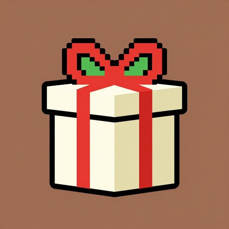 A pixelated gift box with a red ribbon and green leaves on a brown background.