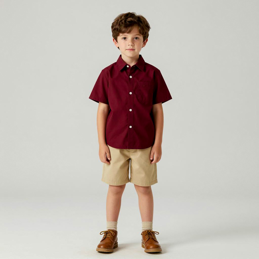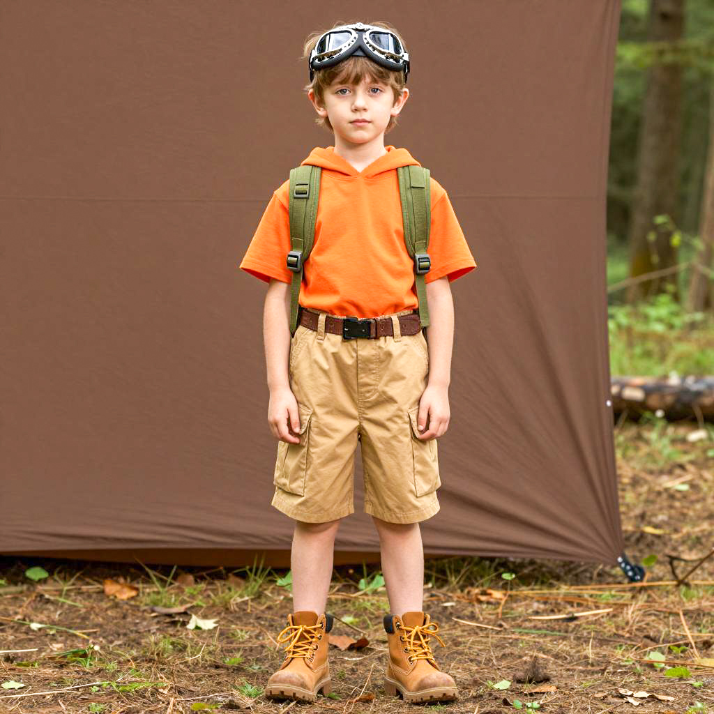 Camping outfit costume, photograph of a young boy, standing outdoors, forest background, brown fabric wall, wearing orange t-shirt, hood up, tan cargo shorts, brown belt, brown boots, green backpack, aviator goggles on head, forest floor, daytime, realistic style, casual adventurer outfit, front view