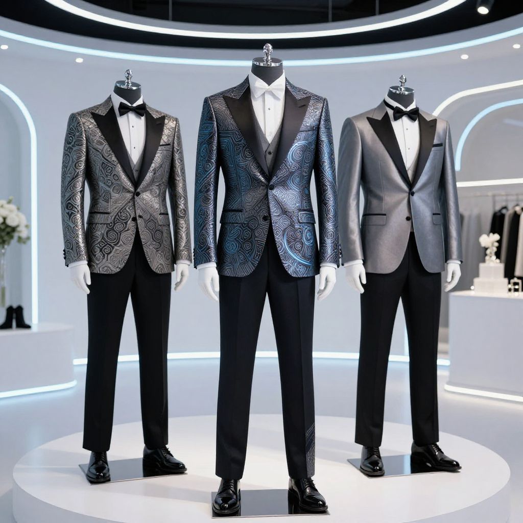 An exquisite suit prompt displayed on a velvet showcase, reflecting golden light, with fine tailoring and rich textures that suggest luxury and sophistication in a high-end fashion studio.