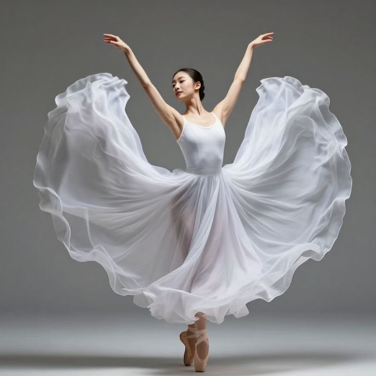 Dress pose reference capturing a dynamic dance movement of a ballerina in a flowing white dress, mid-twirl with fabric swirling, studio lighting emphasizing motion blur, ethereal and graceful, high detail on dress texture and body anatomy.