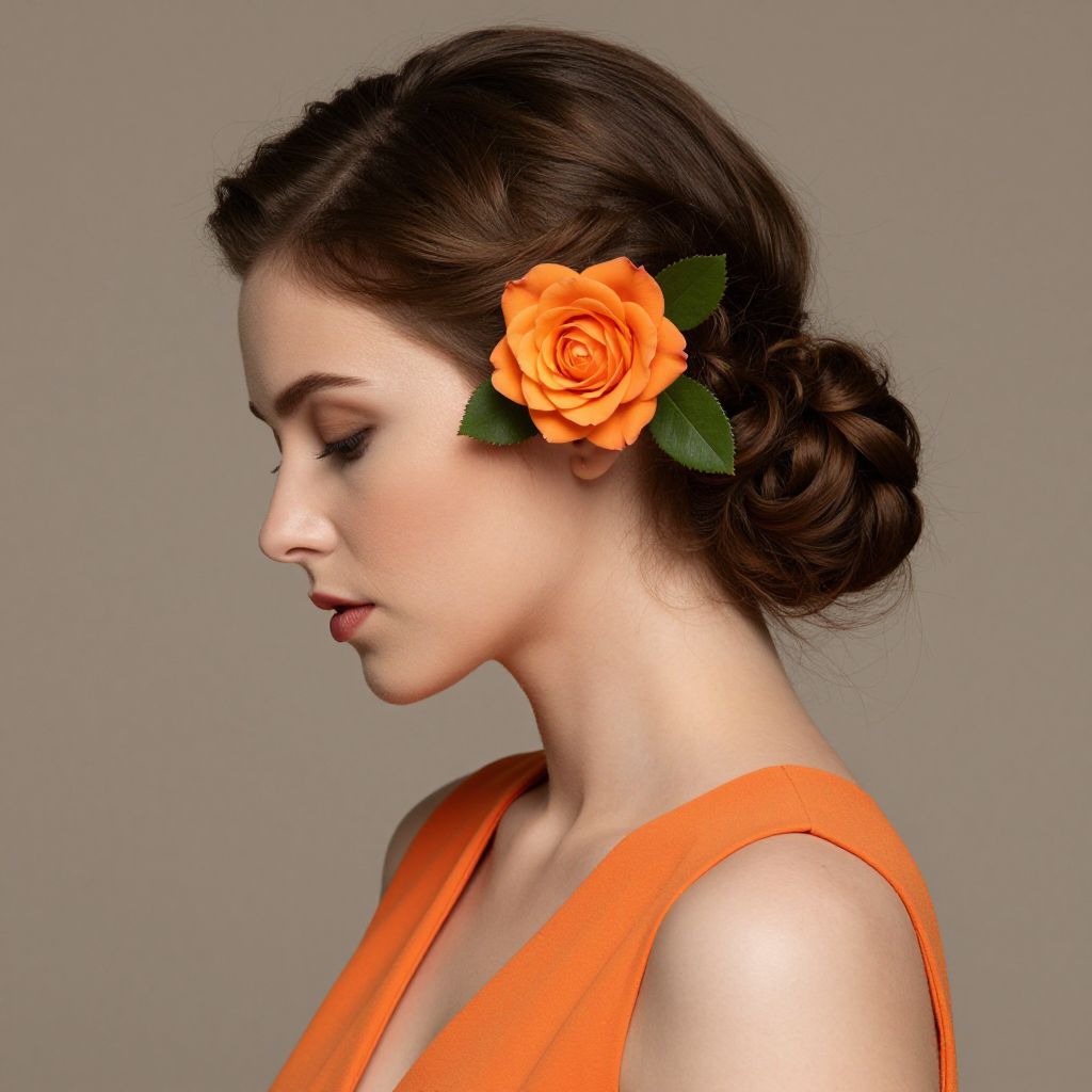 Woman wearing an orange sleeveless dress with a vibrant orange rose and green foliage delicately placed above her right ear, complementing her styled brown hair.