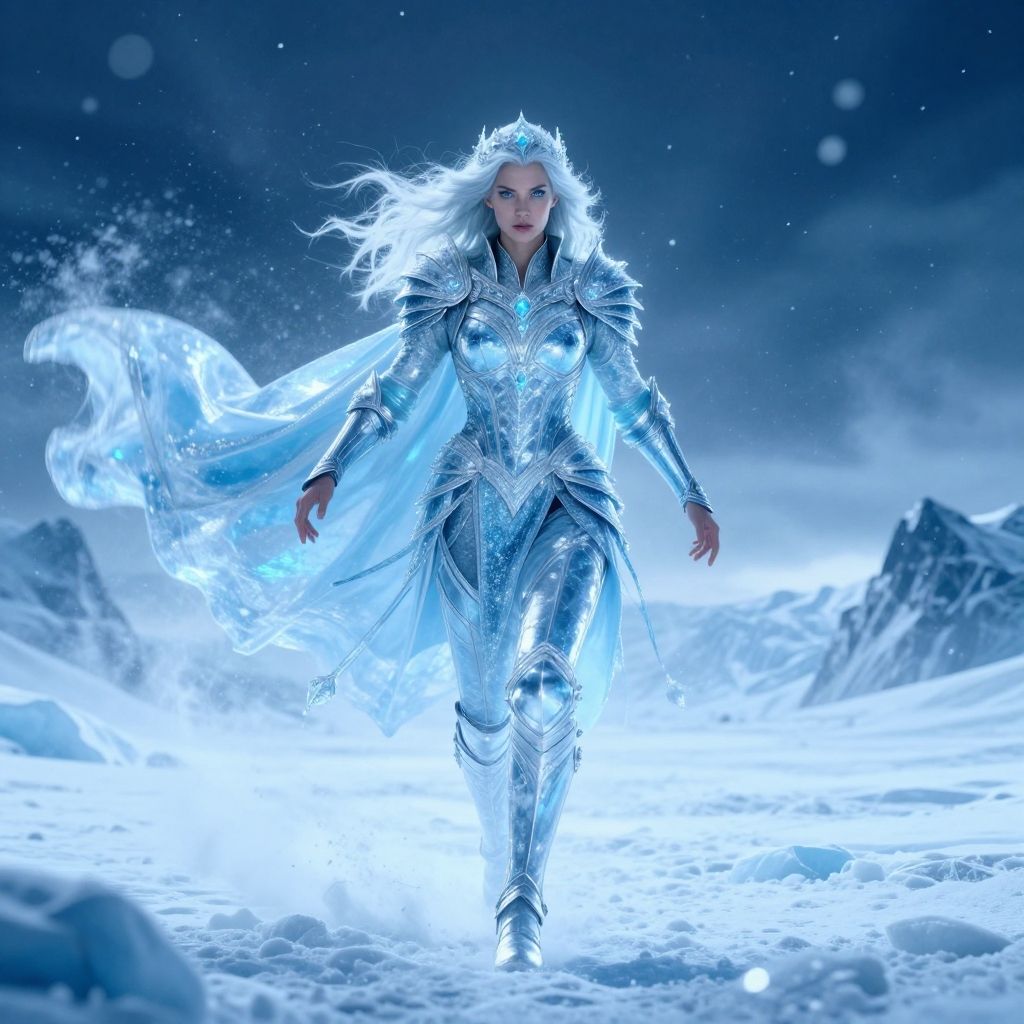 Digital artwork of a white-haired, blue-eyed woman with a fair complexion, wearing intricate, silver-blue ice-themed armor. Her flowing, ethereal cape billows in the wind. She strides confidently through a snowy landscape with glowing, icy blue light illuminating her path. The background features distant, shadowy mountains under a dark, starry sky. Her armor is highly detailed with crystalline patterns, and her expression is determined. The image exudes a cold, magical, and powerful atmosphere. The overall color palette is dominated by shades of blue and white, enhancing the icy, otherworldly feel.