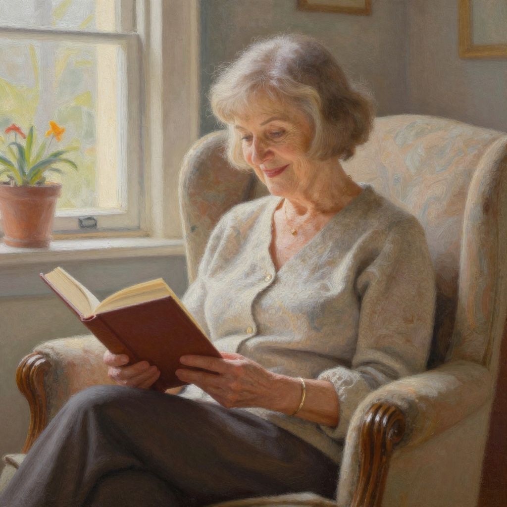 Gracious elderly woman welcoming guests into a sunlit cozy living room, soft golden light filtering through lace curtains, warm smiles, vintage decor, heartfelt atmosphere, impressionist painting style, soft pastel colors, detailed expressions, inviting and peaceful scene
