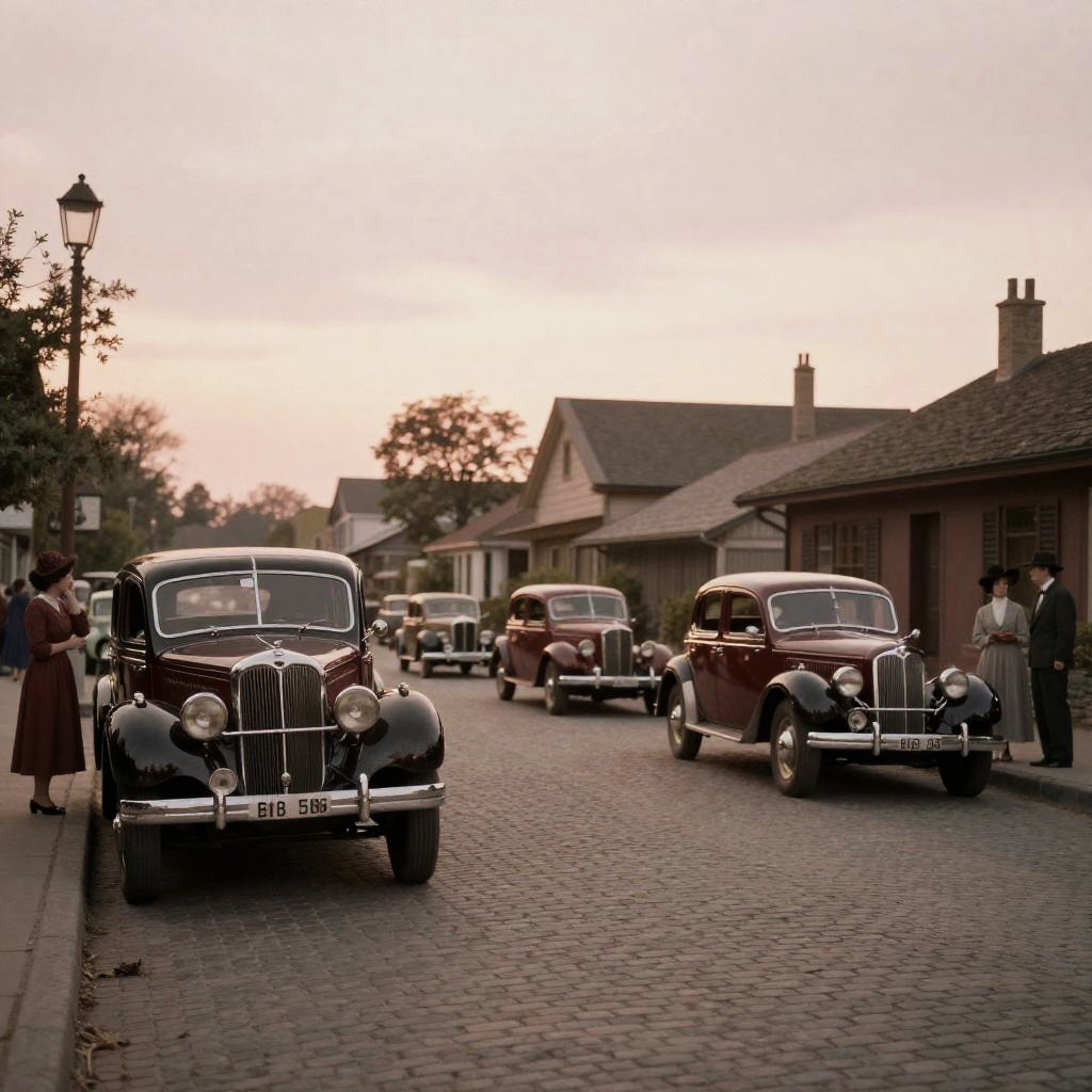 Yesteryear nostalgic street scene at dusk, vintage cars parked along cobblestone roads, soft pastel sky with fading sunlight, elegant people in early 20th-century attire, warm sepia tones, reminiscent of classic postcard photography, subtle film grain