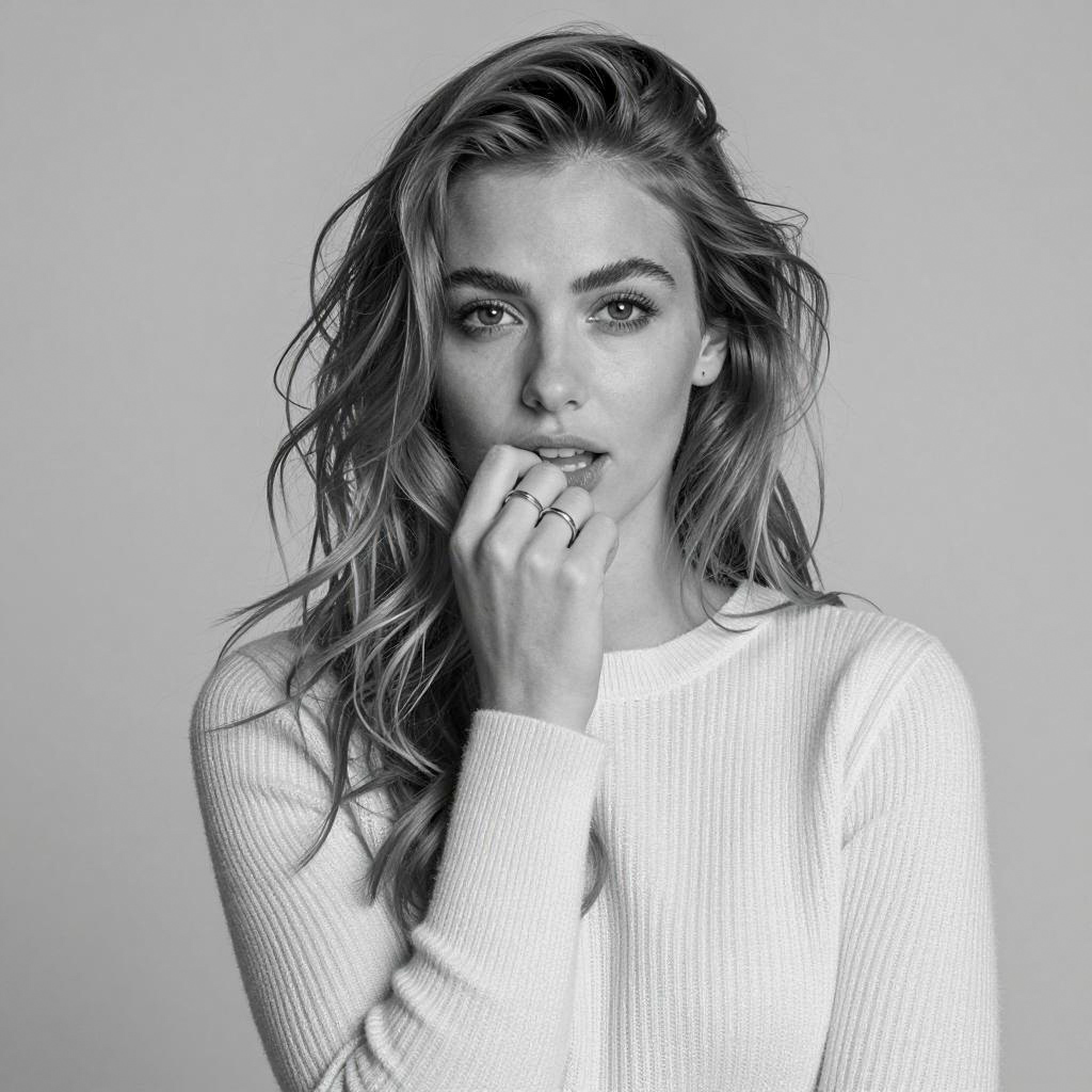Black and white photo of a white woman with long blonde hair, wearing a black hat, long-sleeve top, black gloves, and black boots, squatting with one knee up, index finger near open mouth. Bare buttocks visible. Light gray background.