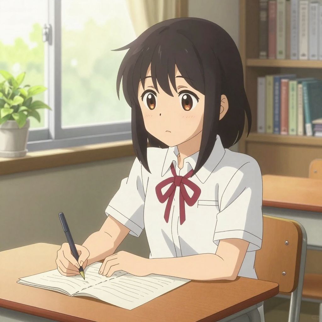 Anime art maker producing a slice-of-life scene, a high school student sitting at a desk with sunlight streaming through the window, warm hues, delicate linework, cozy atmosphere, detailed background with books and plants, soft anime coloring and expressive eyes.