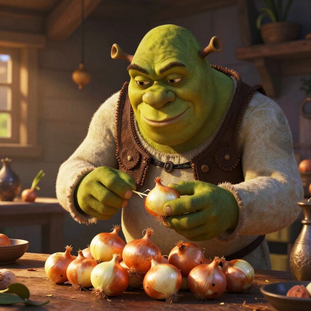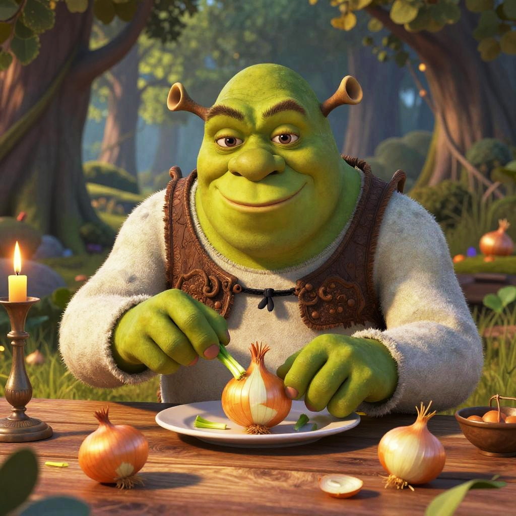 Does Shrek eat onions, detailed character study of a large green ogre sniffing a freshly cut onion in a mystical swamp, misty ambiance, vibrant colors, combination of realism and fantasy illustration, atmospheric depth