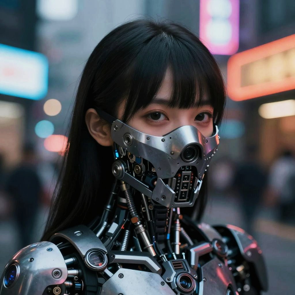 (photorealistic:1.4), (best quality:1.0), (ultra highres:1.0), 8k, RAW photo, (masterpiece:0.2), upper body, mask, mechanical parts, cybernetic, 1girl, asian, black eyes, black hair, (long hair:1.2) with bangs, (cyberpunk street:1.2), neon lights