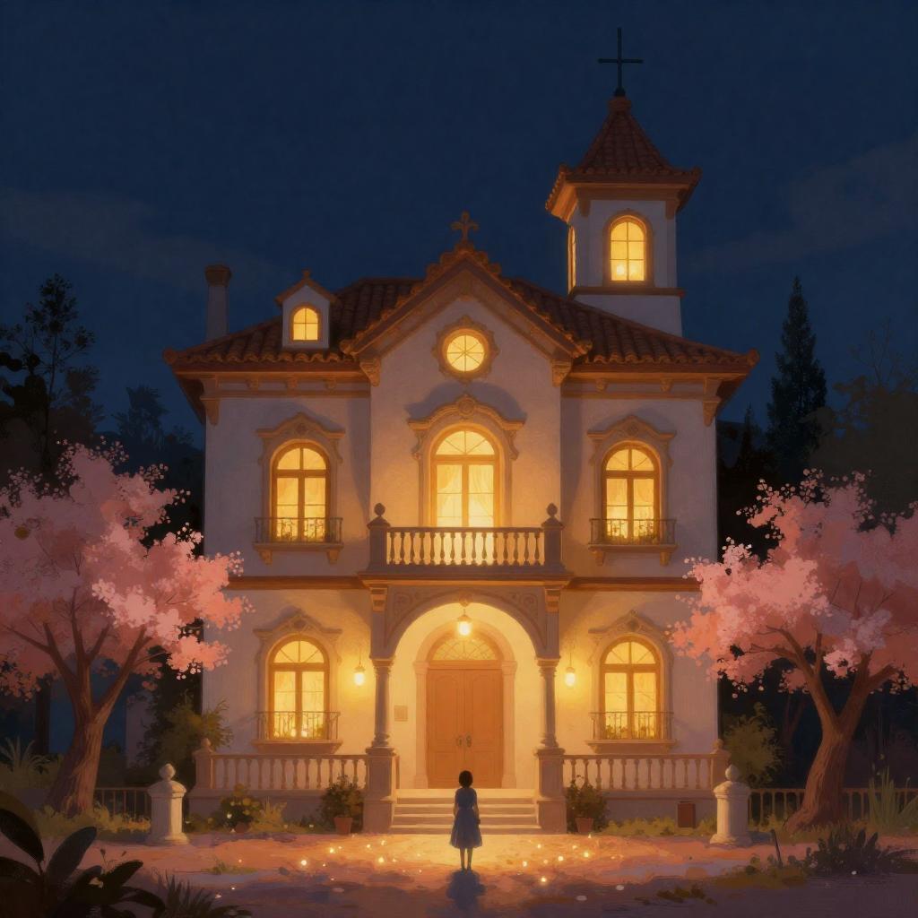 A digital painting of a brightly lit, ornate Spanish-style house at night. The house glows with warm yellow and orange lights, surrounded by pink flowering trees. A small, silhouetted figure in a blue dress stands in the foreground, surrounded by twinkling fairy lights. A tall tower rises above the house.