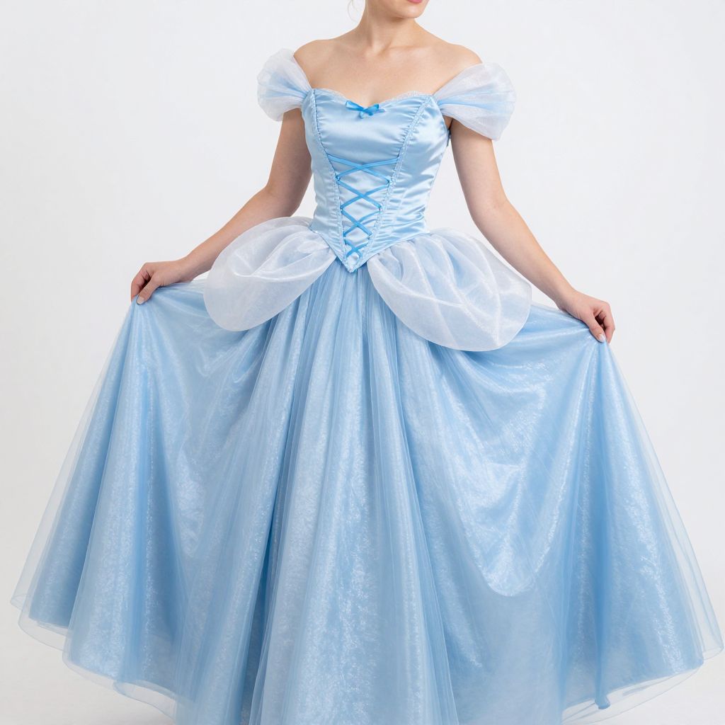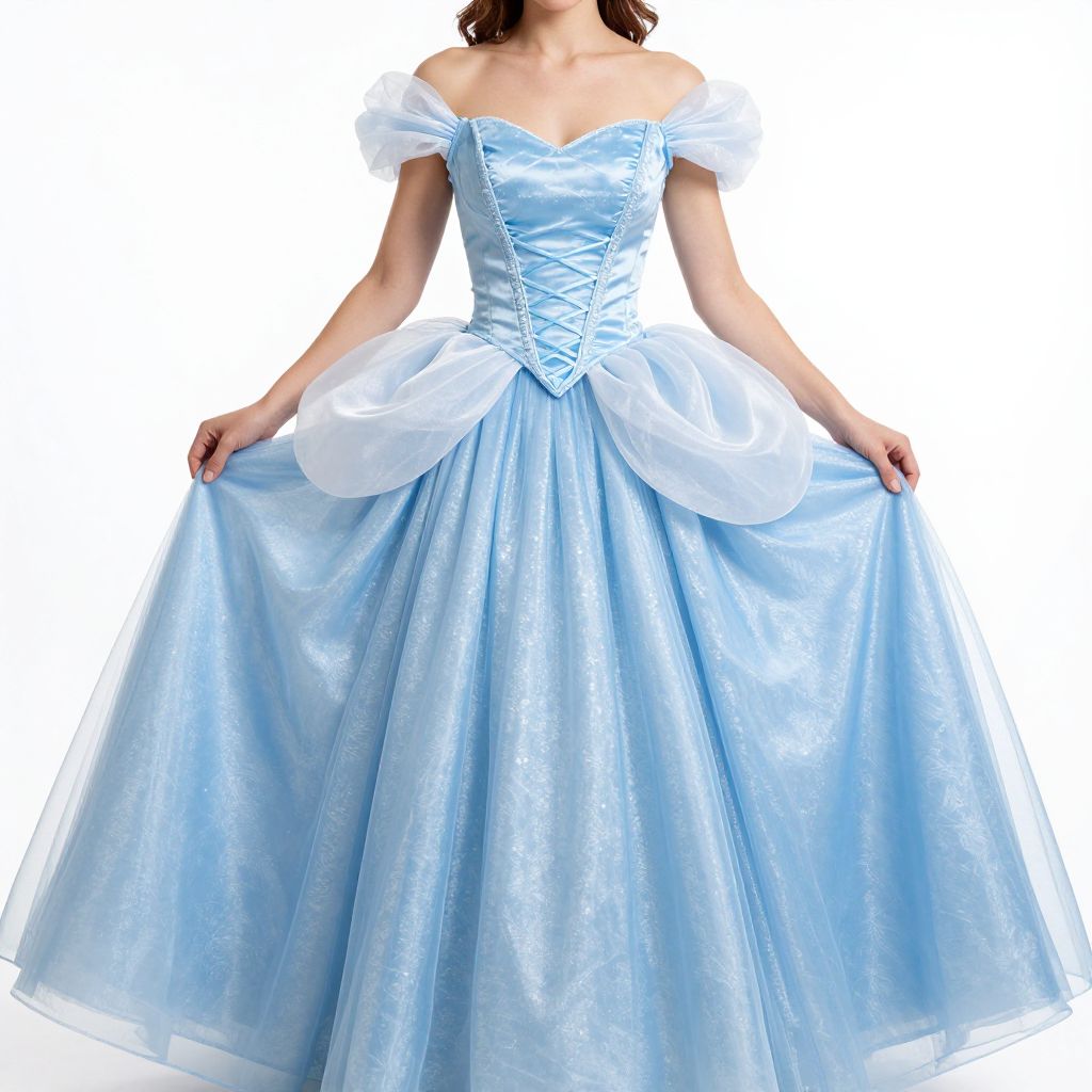 Photograph of a woman wearing a light blue, off-the-shoulder ball gown with a sweetheart neckline. The dress features a fitted, satin bodice with a lace-up front and puffed white sleeves. The voluminous skirt is made of shiny, light blue fabric with a subtle floral pattern. She holds the sides of the skirt, which has a slight transparency at the bottom, revealing a thin, white layer underneath. The background is plain white, emphasizing the dress. The woman's face is not visible, focusing attention on the elegant, fairy-tale-inspired costume.