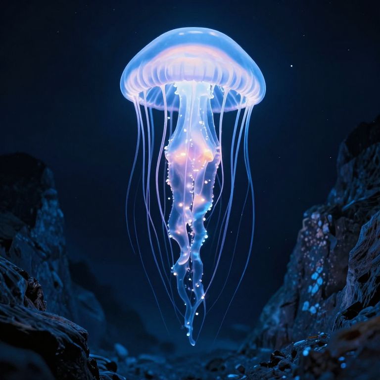 Photograph of a glowing blue jellyfish with translucent, flowing tentacles, illuminated against a dark, rocky underwater background.