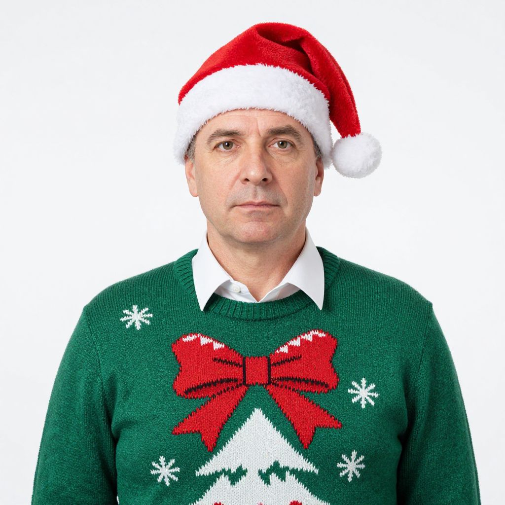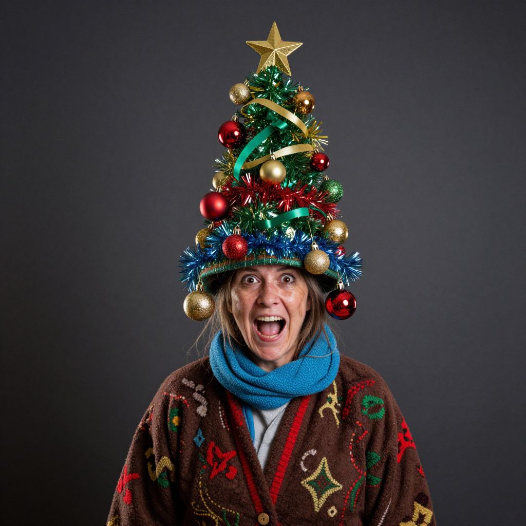 In this image, a surprised, filthy homeless woman with a toothless mouth is the central figure. She is adorned with a Christmas tree-shaped dunce hat, covered in a variety of ornaments including red, gold, and green baubles, tinsel, and ribbons. The hat is intricately decorated, with ornaments hanging from the brim and the top. The woman's attire consists of a brown robe with red and green patterns, and a blue scarf wrapped around her neck. The background is a plain, dark gray, which contrasts with the vibrant colors of the ornaments and the woman's clothing. The overall composition is dynamic, with the woman's surprised expression and the festive decorations creating a sense of movement and energy.
