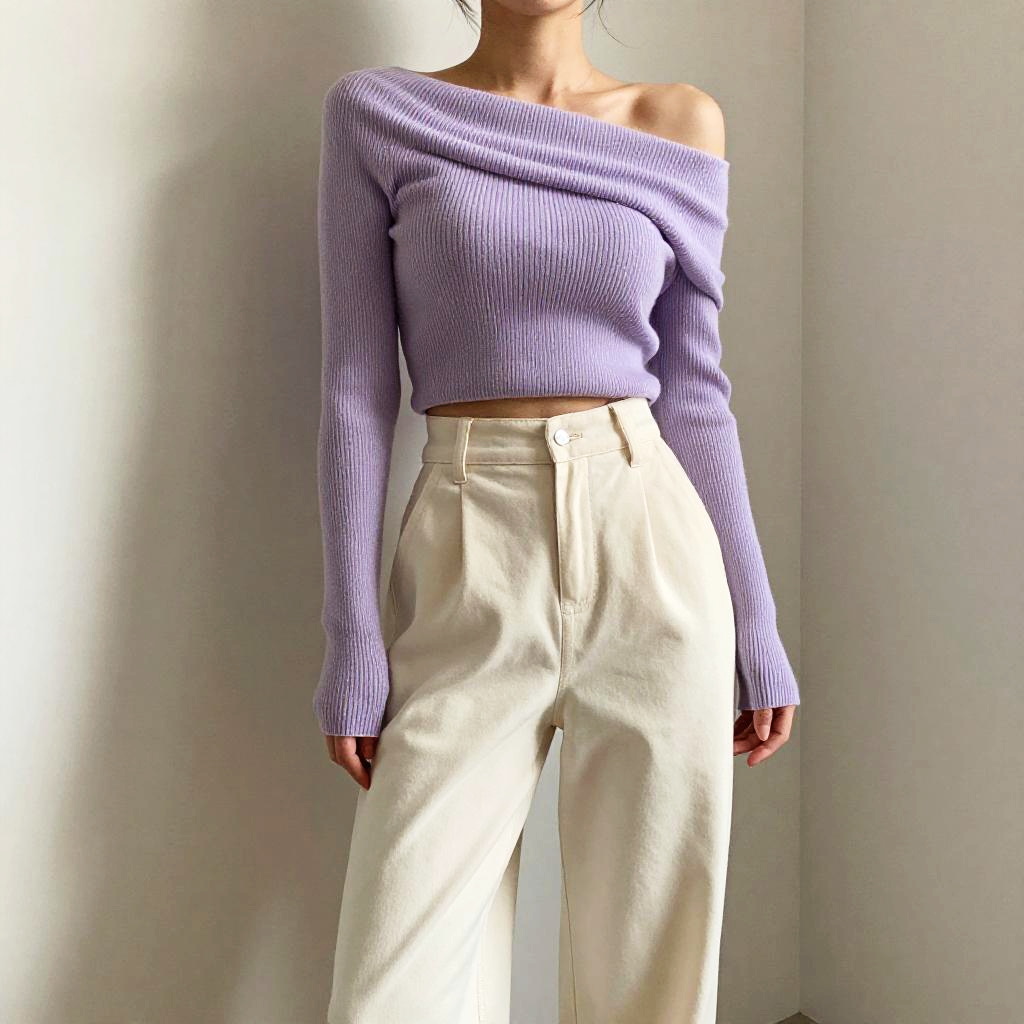 A stylish woman poses confidently against a plain neutral wall, wearing a lilac off-shoulder ribbed crop sweater paired with high-waisted wide-leg cream trousers. The minimalistic background and elegant outfit highlight modern fashion with a chic, casual vibe.