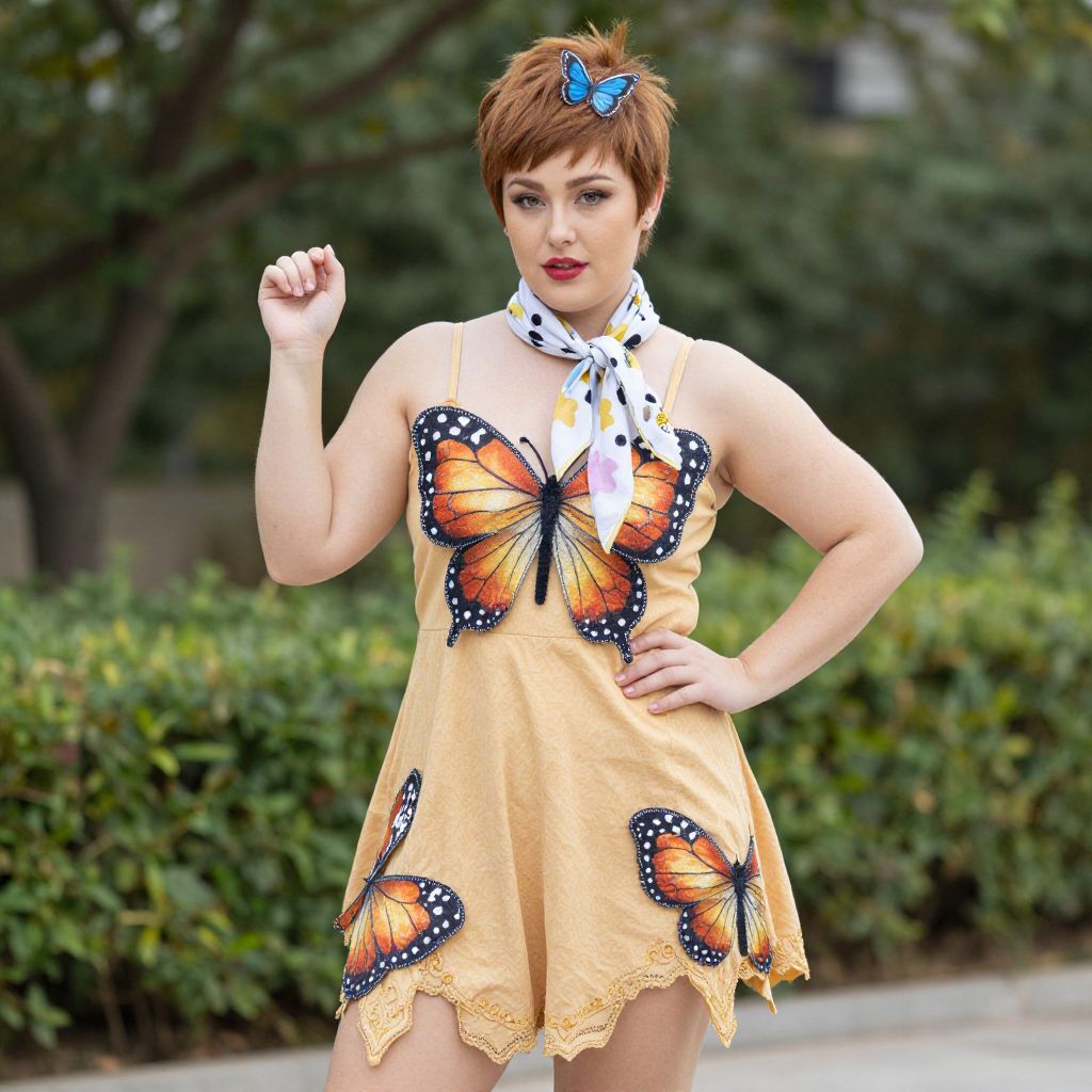 Photograph of a fair-skinned woman with short, brown hair adorned with a blue butterfly clip. She wears a sleeveless, yellow dress with orange and black butterfly prints on the chest and lower hem, and a white scarf with yellow butterflies around her neck. Her right hand is raised in a fist, and her left hand rests on her hip. She has red lipstick and a confident expression. The background features green, leafy bushes and blurred trees, suggesting an outdoor setting. The image has a vibrant, lively color palette.