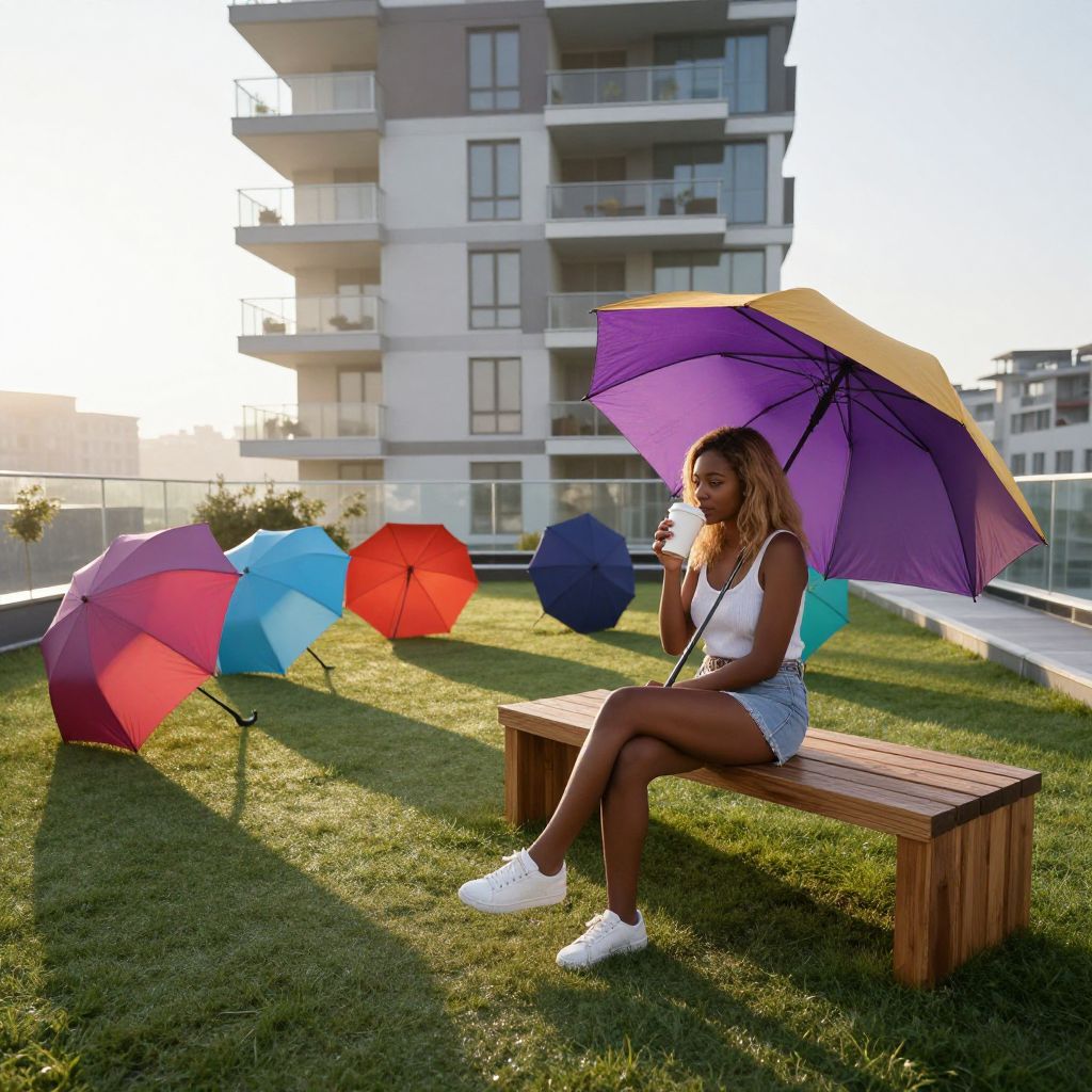 A rooftop garden in a modern apartment building at dawn, where vibrant umbrellas are arranged like sculptures in a geometric pattern, a young woman with soft brown skin and natural blonde hair sits on a wooden bench under a large violet-and-gold umbrella, sipping coffee, with soft morning light casting long shadows and dew on the grass below.