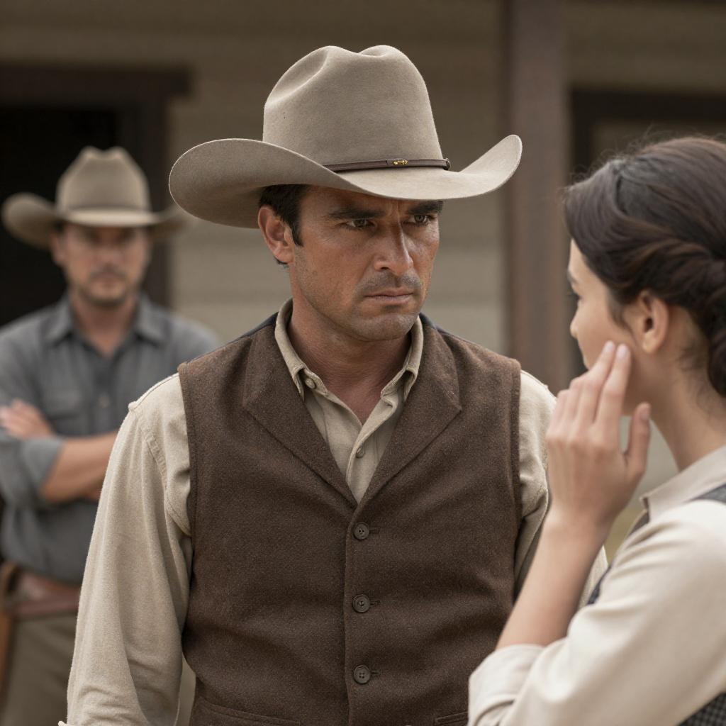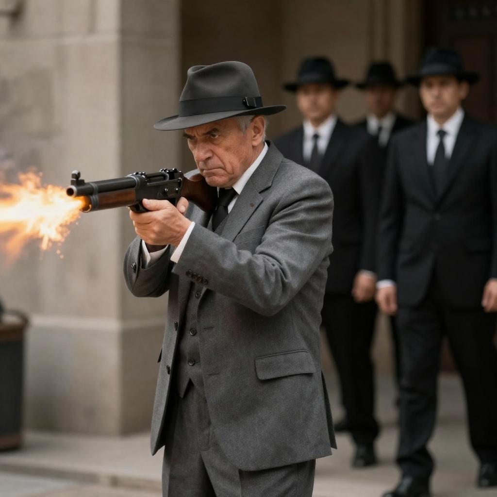 Western-style photograph. Central male in blue shirt, grey hat, holding black pistol, intense expression. Surrounding men in suits and vests, grey hats, standing on wooden porch. Background includes chair and house siding. Multiple men in various poses. Sunlight casting shadows.