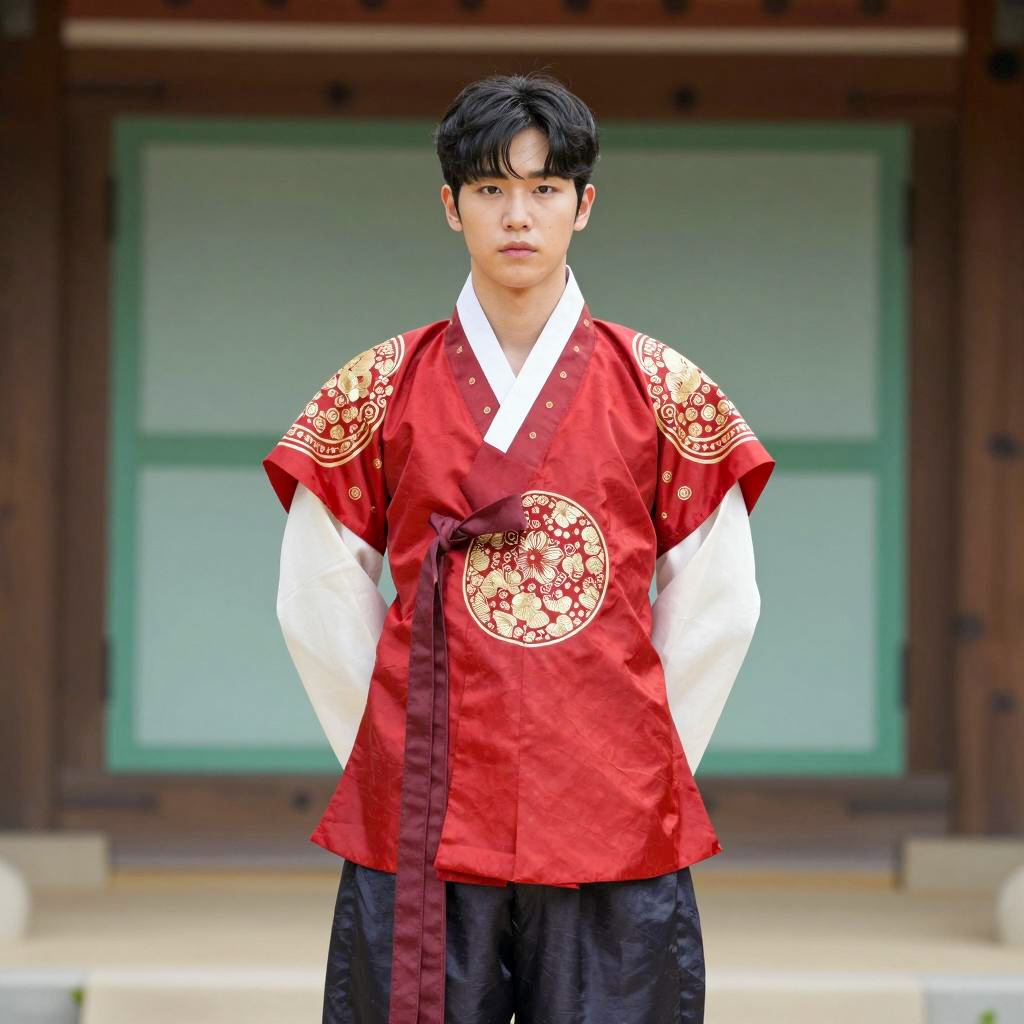 Portrait of a young Asian man wearing a traditional Korean hanbok featuring a red silk top with intricate gold patterns and black pants. The man has short black hair and a serious expression. The background shows a green and brown structure, suggesting a traditional Korean setting, captured during daytime with natural lighting.