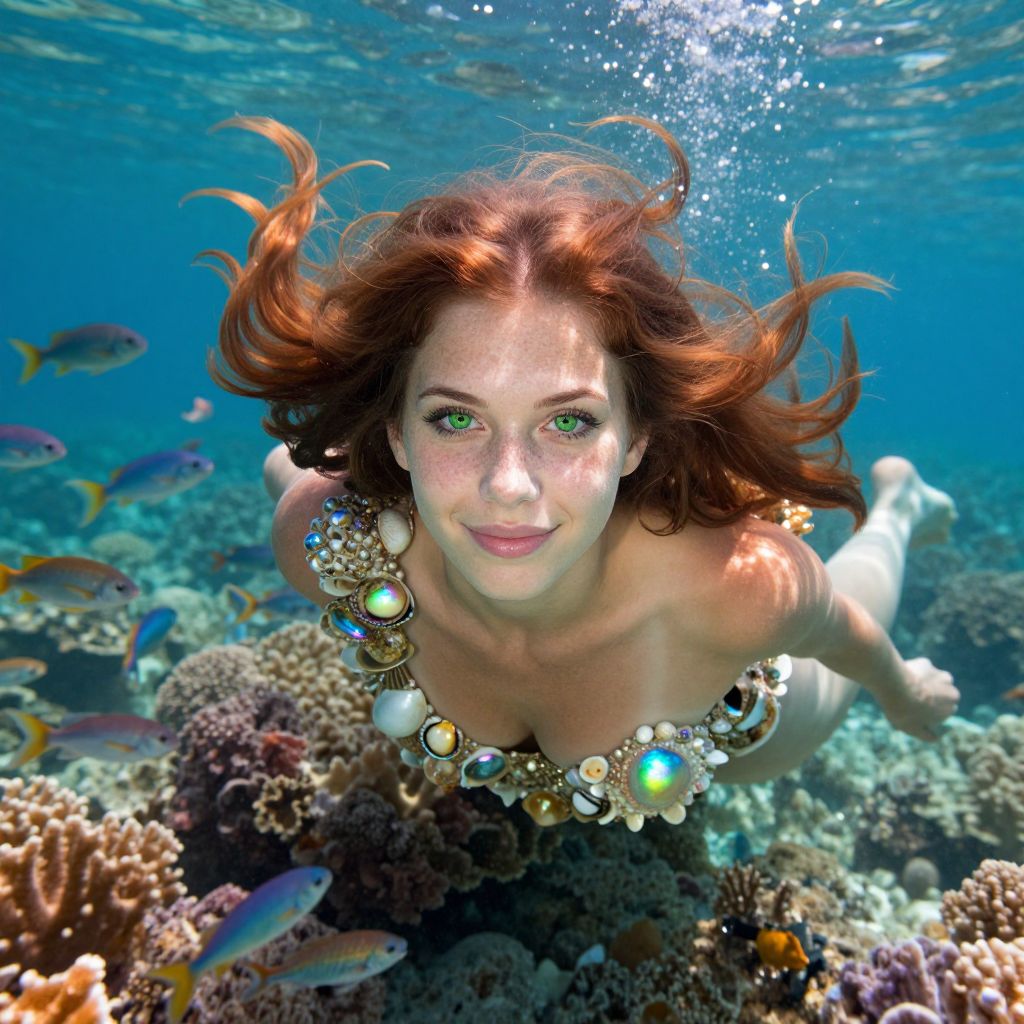 Photograph of a red-haired woman with green eyes swimming underwater, surrounded by colorful coral and fish, wearing a beaded necklace.