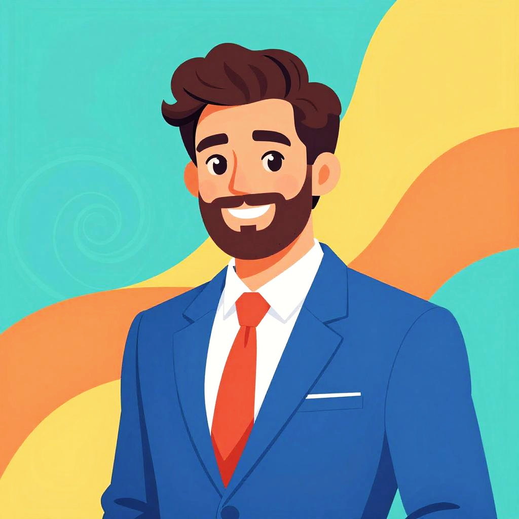 Digital illustration of a smiling, bearded man with dark brown hair, wearing a blue suit, white dress shirt, and red tie. His skin is light, and his facial features are cartoonish with large, expressive eyes. The background is bright turquoise with abstract, wavy yellow and orange shapes. The man's confident, friendly demeanor is emphasized by his open smile and relaxed posture. The style is colorful and modern, with bold, clean lines and a playful, upbeat aesthetic.