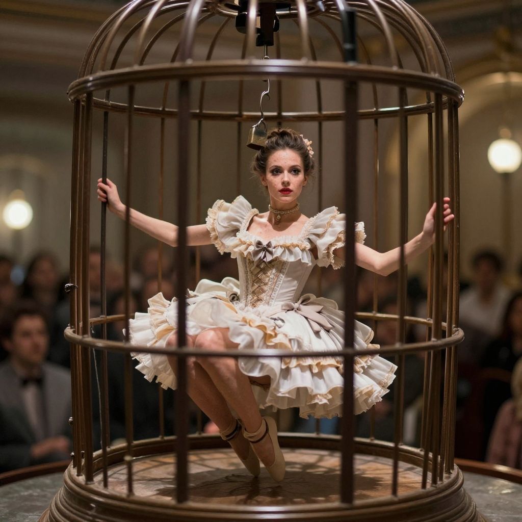 DEN_elua_sg, (locked in a giant birdcage swinging on a bar dress in frilly burlesque clothing, Bird cage, trapped, caged, behind bars:1.2), bokeh, f1.4, 40mm, photorealistic, raw, 8k, textured skin, skin pores