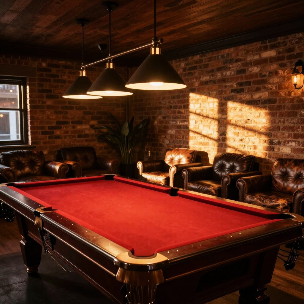 Cozy lounge featuring a red velvet pool table, distressed leather chairs, exposed brick walls, soft golden lighting casting shadows, wood paneled ceiling, vibrant red felt surface gleaming
