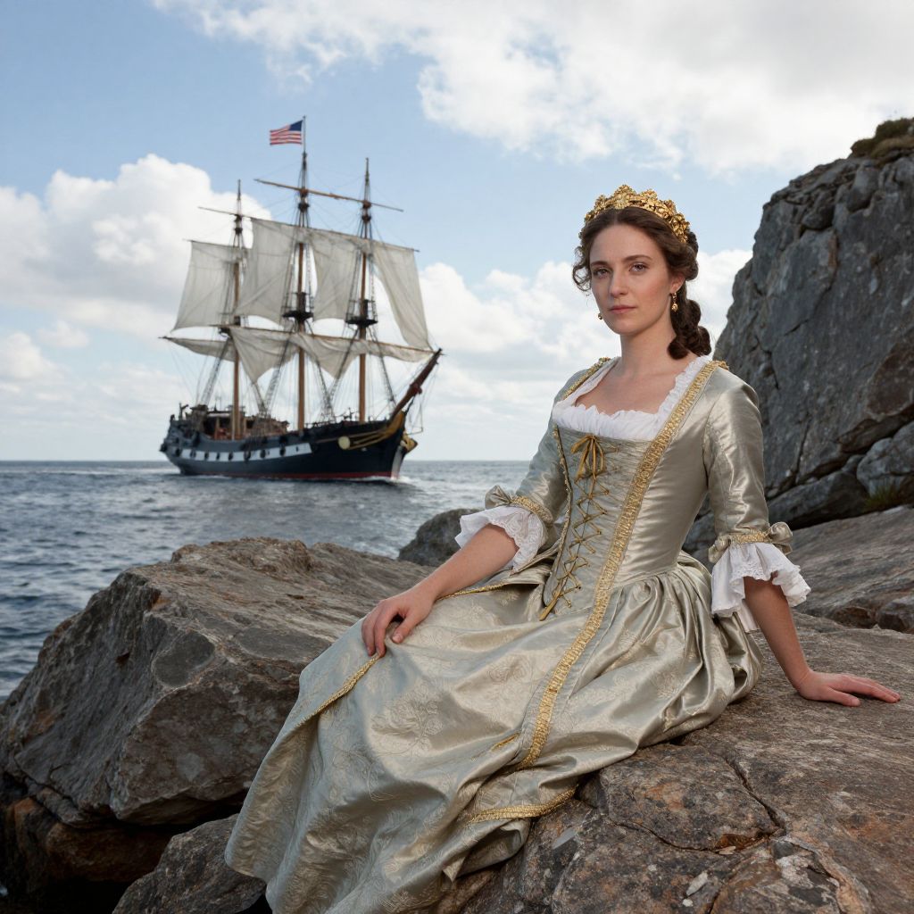 Seated gracefully against rocky cliffs, a woman in an elegant 18th-century gown adorned with a gold headpiece and corset gazes serenely toward the viewer, with a majestic three-masted ship flying an American flag sailing peacefully on the horizon beneath a partly cloudy sky.