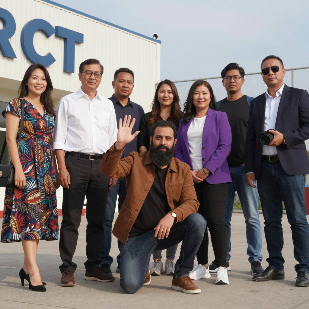 A group of nine diverse adults posing outdoors in front of a building with large blue letters partially visible. The group includes men and women of Asian ethnicity, dressed in casual and business casual attire. A bearded man in a brown jacket kneels in the center waving, while others stand behind him. Background features a chain-link fence and clear blue sky.