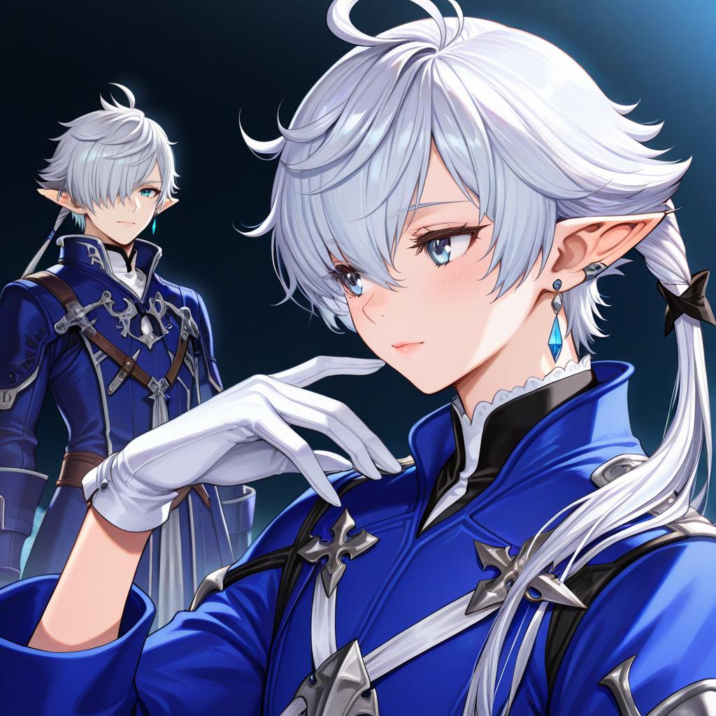 Alphinaud leveilleur, final fantasy, 1boy, blue eyes, hair between eyes, hair over one eye, white hair, long hair, grey hair, ahoge, ponytail, hair ribbon, white gloves, blue coat, earrings, elezen, earclip, by artist ayasugi tsubaki, illustrious