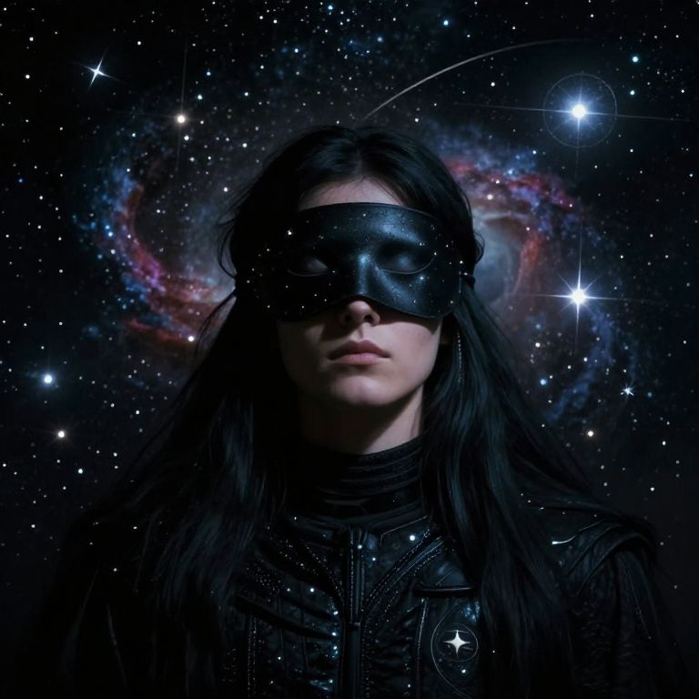 Photograph of a mysterious woman with long black hair, wearing a black blindfold, against a starry, cosmic nebula background.