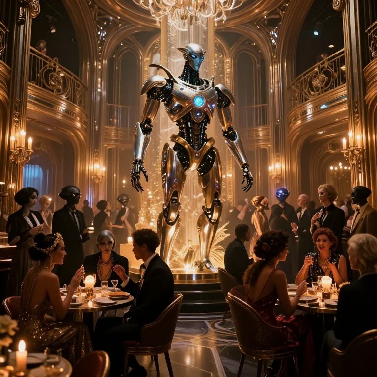Photograph of a luxurious, dimly-lit ballroom with ornate gold-trimmed walls and arched ceilings. A tall, glowing, black robotic figure with blue eye and chest lights stands at the center, surrounded by a crowd of elegantly dressed men and women seated at round tables adorned with candles and fine china. The attendees, diverse in ethnicity and age, engage in conversation and dining, creating a sophisticated, yet futuristic atmosphere. The background features chandeliers and intricate architectural details, enhancing the opulent setting. The overall scene blends classic elegance with sci-fi elements.