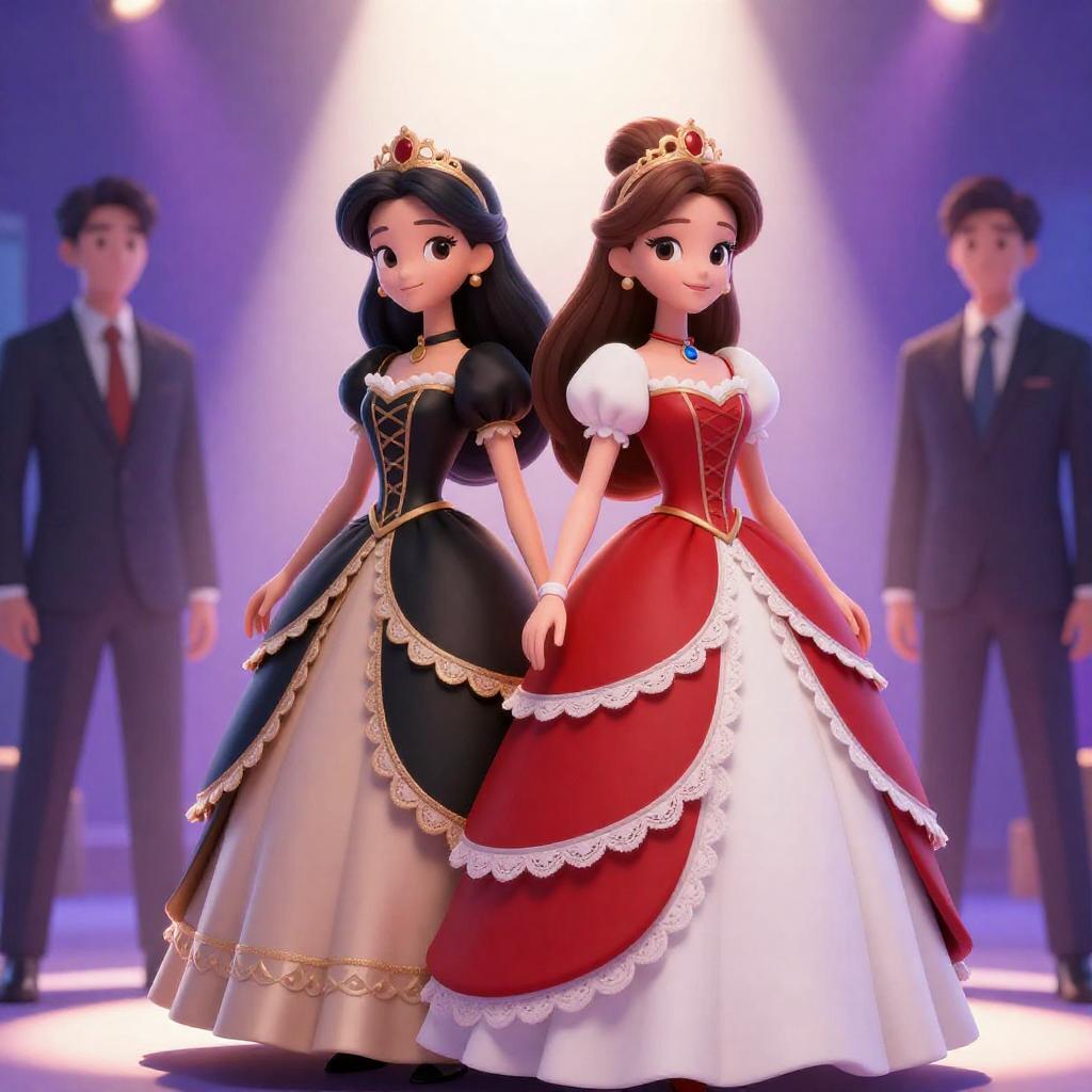 Digital illustration of two animated princesses. The left princess has long, dark purple hair, wears a black and purple dress, and holds a small object. The right princess has long, blonde hair, wears a red and pink floral dress, and looks surprised. They stand in a futuristic, neon-lit setting with a table and abstract background.