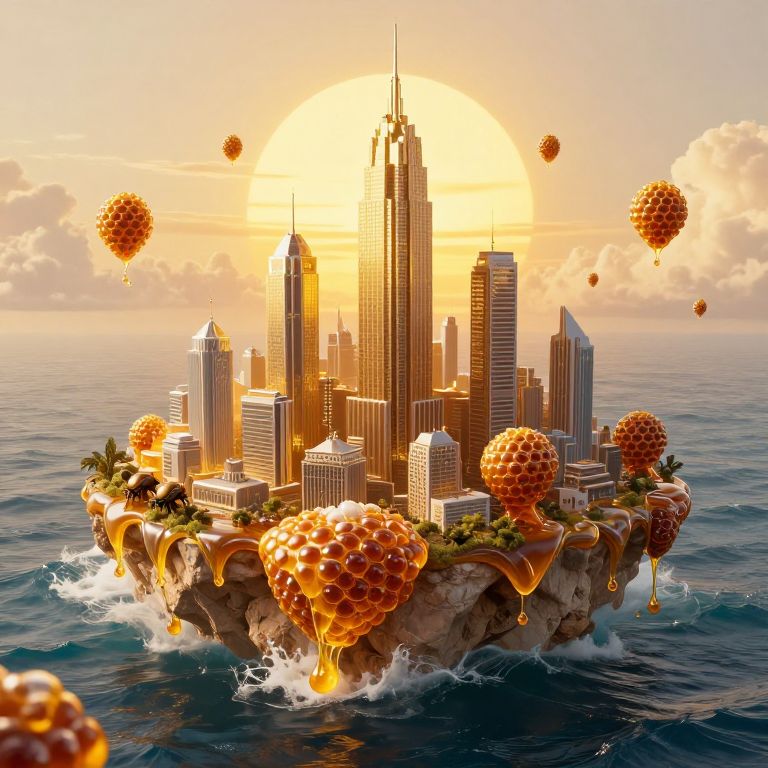 An ocean of gelatinous honey swallows an island city, where enormous beehives gleam like skyscrapers under a golden sun.