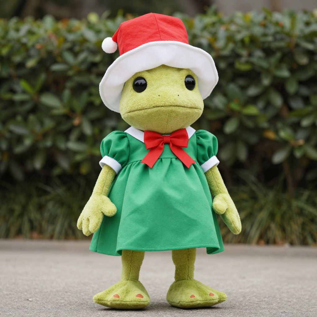 Photograph of a green, anthropomorphic frog mascot wearing a red Santa hat, green puffy-sleeve dress with white trim, and red bow