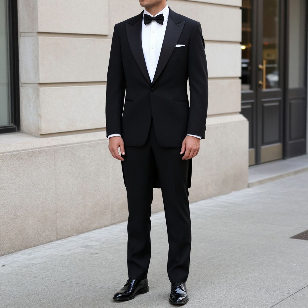 Photograph of a man standing on a city sidewalk, wearing a black formal tuxedo with a white dress shirt and black bow tie. His black dress shoes are polished, and there is a white pocket square in his left breast pocket. The background features a beige stone building with large black-framed windows and a dark glass door. The sidewalk is light gray concrete, and the man's face is not visible in the image. The overall style is classic and elegant, with a focus on formal attire.