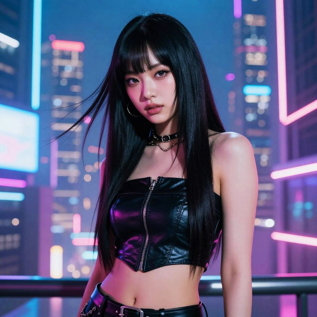 Jimin long hair with subtle waves, futuristic cyberpunk aesthetic, glowing blue and purple tones, sleek leather jacket, intense gaze, ultra-modern cityscape
