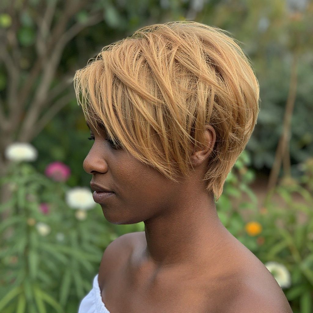 Photograph of a dark-skinned woman with short, layered, blonde hair styled in a messy, side-swept fashion. She has a slender build and is wearing a white, strapless top. Her face is turned in profile, showing her smooth, dark brown skin and subtle makeup. The background is a blurred garden with green foliage and colorful flowers, including pink and white blooms. The lighting is natural, highlighting the texture of her hair and her calm expression. The overall style is realistic with a focus on natural beauty and outdoor setting.