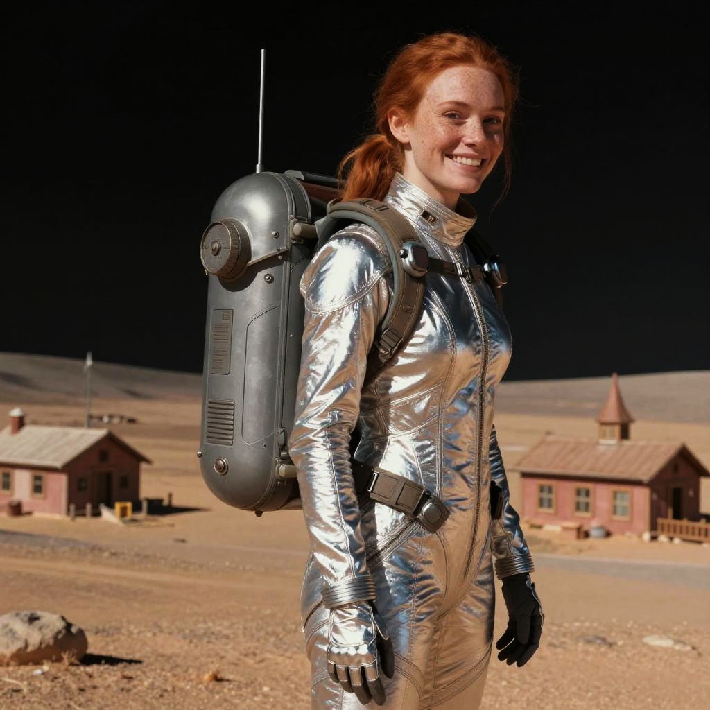 Photograph of a smiling red-haired woman standing in a desolate, desert-like landscape with small, rustic buildings in the background. She is wearing a shiny, silver-colored spacesuit with black gloves and a large, gray backpack with an antenna on her back. The suit's texture is reflective and metallic. The sky is dark, contrasting with the bright sunlight illuminating the scene. The woman's fair skin and freckles are visible. The background includes two brown-roofed houses and a small tower-like structure. The overall impression is futuristic yet grounded in a rugged, arid environment.