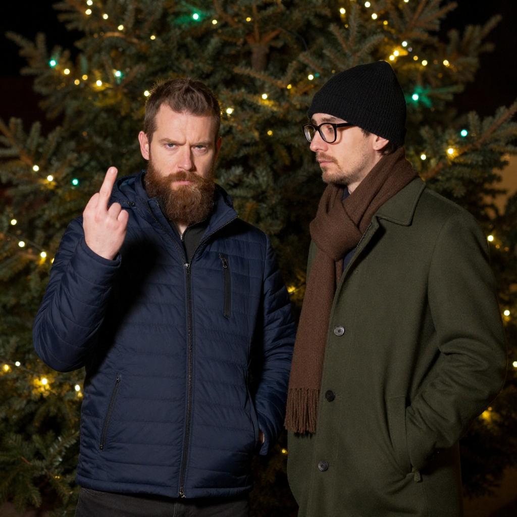 Two men standing outdoors at night. Bearded man on left in blue quilted jacket, flashing two fingers up, with a serious expression. Man on right in green coat, black beanie, glasses, and brown scarf, looking at the left man. Christmas tree with lights in background, warm yellow and green lights. Both men have hands in pockets.