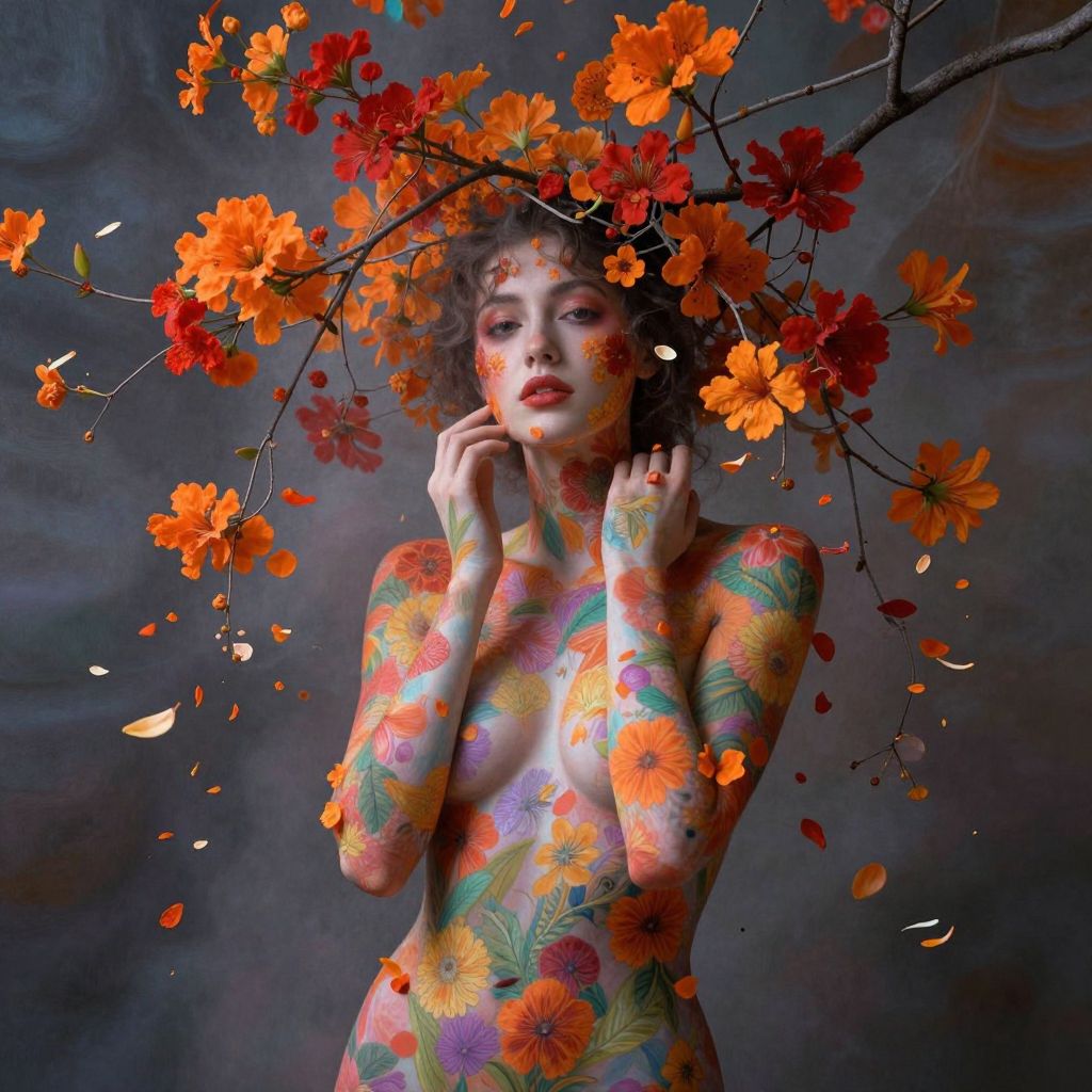Whispers of vibrant orange and red flowers cascade through ethereal branches, intertwining with a woman's skin adorned in a kaleidoscope of floral patterns, as delicate petals float around her in a dreamlike, ever-changing tapestry.
