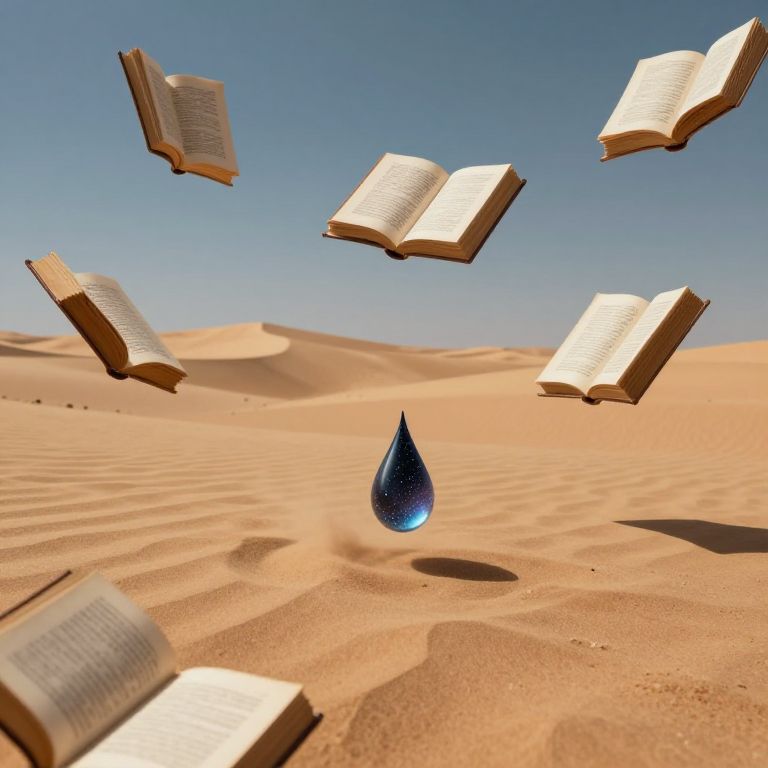A lonely teardrop made of stardust rolls across a vast desert of floating, whispering books, each page murmuring forgotten truths only the wind understands.